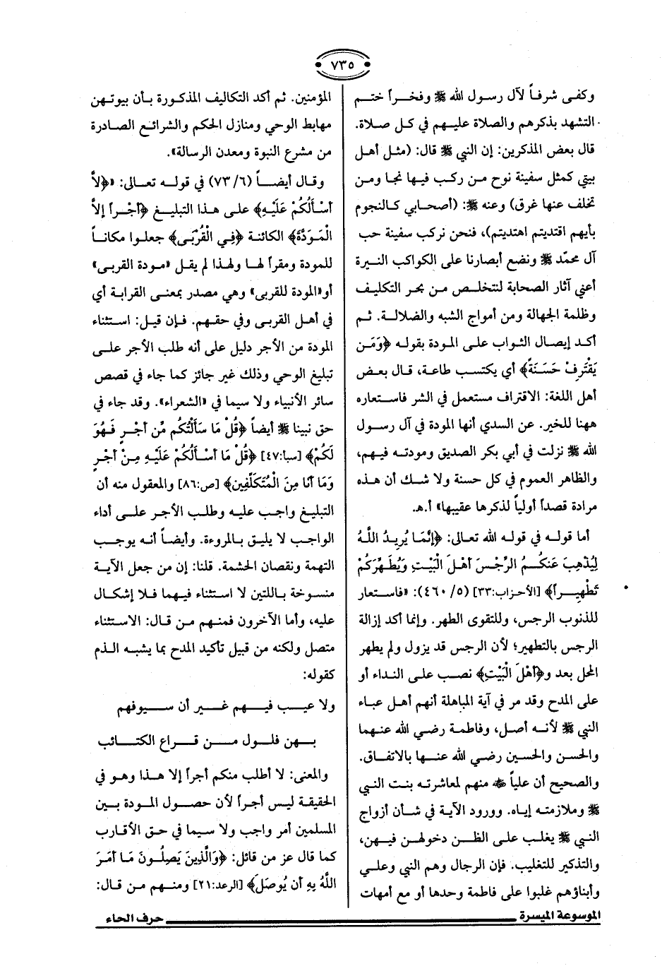 أما قوله في قوله الله تعالى: {إِنَّمَا يُرِيدُ اللَّهُ لِيُذْهِبَ عَنْكُمُ الرِّجْسَ أَهْلَ الْبَيتِ وَيُطَهِّرَكُمْ تَطْهِيرًا} [الأحزاب: 33] (5/ 460): "فاستعار للذنوب الرجس، وللتقوي الطهر، وإنما أكد إزالة الرجس بالتطهير؛ لأن الرجس قد يزول ولم يطهر المحل بعد و {أهْلَ الْبَيتِ} نصب علي النداء أو علي المدح وقد مر في آية المباهلة أنهم أهل عباء النبي - صلى الله عليه وسلم - لأنه أصل، وفاطمة رضي الله عنهما والحسن والحسين رضي الله عنها بالاتفاق. والصحيح أن عليًّا - رضي الله عنه - منهم لمعاشرته بنت النبي - صلى الله عليه وسلم - وملازمته إياه. وورود الآية في شأن أزواج النبي - صلى الله عليه وسلم - يغلب علي الظن دخولهن فيهن، والتذكير للتغليب. فإن الرجال وهم النبي وعلي وأبناؤهم غلبوا علي فاطمة وحدها أو مع أمهات المؤمنين. ثم أكد التكاليف المذكورة بأن بيوتهن مهابط الوحي ومنازل الحكم والشرائع الصادرة من مشرع النبوة ومعدن الرسالة".