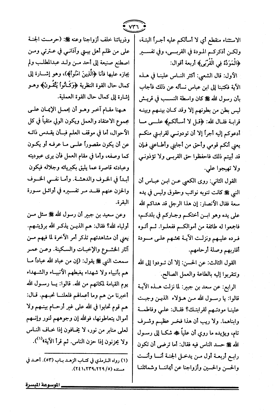 الرابع: عن سعد بن جبير: لما نزلت هذه الآية قالوا: يا رسول الله من هؤلاء الذين وجبت علينا مودتهم لقرابتك؟ فقال: علي وفاطمة وابناهما. ولا ريب أن هذا فخر عظيم وشرف تام، ويؤيده ما روي أن عليًّا شكا إلي رسول الله - صلى الله عليه وسلم - حسد الناس فيه فقال: أما ترضي أن تكون رابع أربعة أول من يدخل الجنة أنا وأنت والحسن والحسن وأزواجنا عن أيماننا وشمائلنا وذرياتنا خلف أزواجنا وعنه - صلى الله عليه وسلم -: (حرمت الجنة علي من ظلم أهل بيتي وآذاني في عترتي ومن اصطنع صنيعة إلي أحد من ولد عبد المطلب ولم يجازه عليها فأنا {الَّذِينَ آمَنُوا})، وهو إشارة إلي كمال حال القوة النظرية {وَكَانُوا يَتَّقُونَ} وهو إشارة إلي كمال حال القوة العملية.