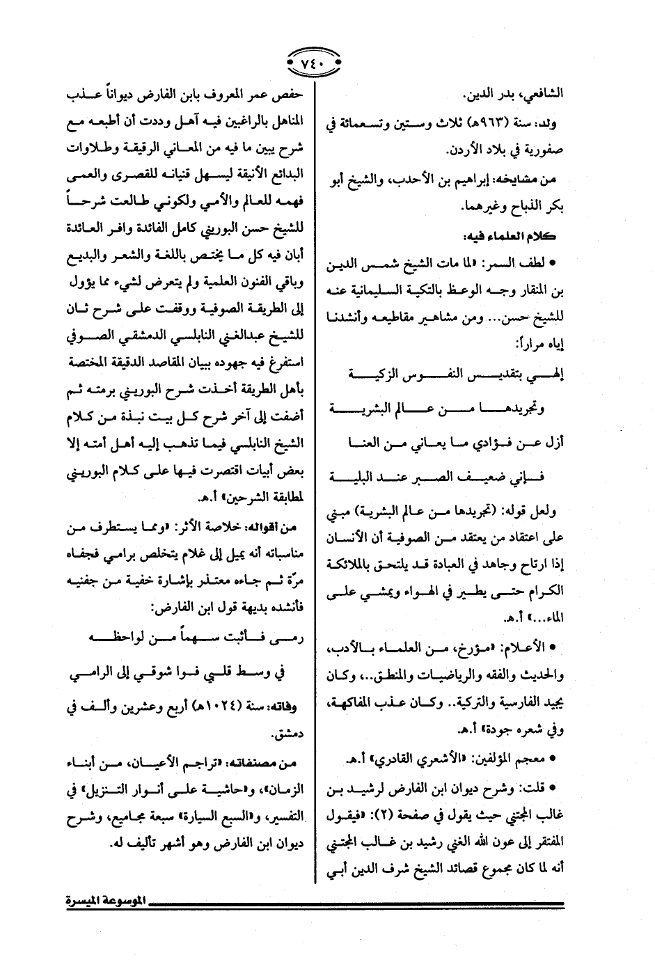 • قلت: وشرح ديوان ابن الفارض لرشيد بن غالب المجتني حيث يقول في صفحة (2): "فيقول المفتقر إلي عون الله الغني رشيد بن غالب المجتني أنه لما كان مجموع قصائد الشيخ شرف الدين أبي حفص عمر المعروف بابن الفارض ديوانًا عذب المناهل بالراغبين فيه آهل وددت أن أطبعه مع شرح يبين ما فيه من المعاني الرقيقة وطلاوات البدائع الأنيقة ليسهل قنيانه للقصري والعمي فهمه للعالم والأمي ولكوني طالعت شرحًا للشيخ حسن البوريني كامل الفائدة وافر العائدة أبان فيه كل ما يختص باللغة والشعر والبديع وباقي الفنون العلمية ولم يتعرض لشيء مما يؤول إلي الطريقة الصوفية ووقفت علي شرح ثان للشيخ عبد الغني النابلسي الدمشقي الصوفي استفرغ فيه جهوده ببيان المقاصد الدقيقة المختصة بأهل الطريقة أخذت شرح البوريني برمته ثم أضفت إلي آخر شرح كل بيت نبذة من كلام الشيخ النابلسي فيما تذهب إليه أهل أمته إلا بعض أبيات اقتصرت فيها علي كلام البوريني لمطابقة الشرحين" أ. هـ.