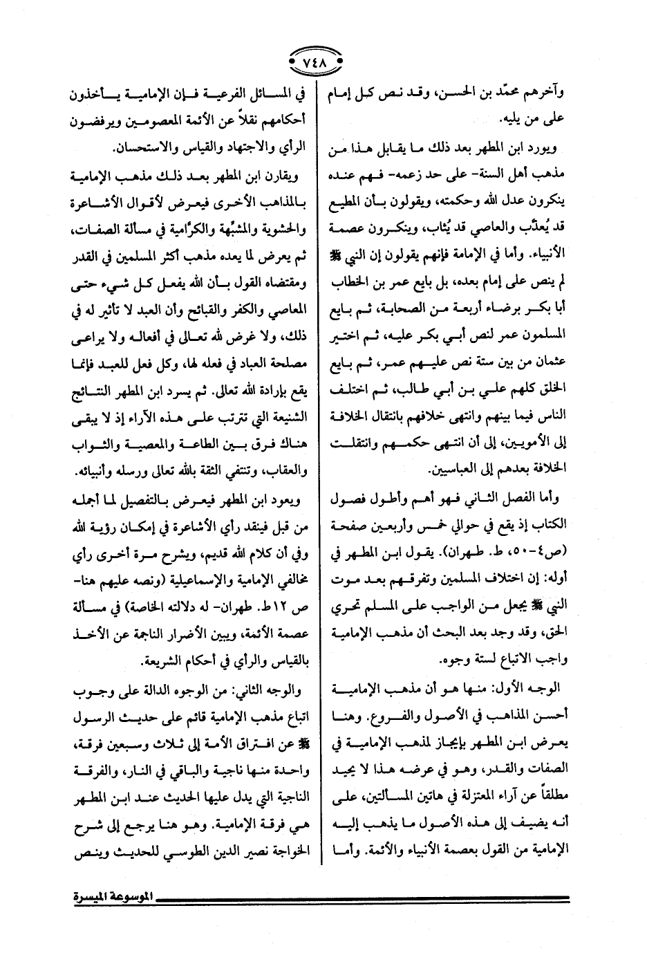 ويعود ابن المطهر فيعرض بالتفصيل لما أجمله من قبل فينقد رأي الأشاعرة في إمكان رؤية الله وفي أن كلام الله قديم، ويشرح مرة أخرى رأي مخالفي الإمامية والاسماعيلية (ونصه عليهم هنا- ص 12 ط. طهران- له دلالته الخاصة) في مسألة عصمة الأئمة، ويبين الأضرار الناجمة عن الأخذ بالقيامى والرأي في أحكام الشريعة.