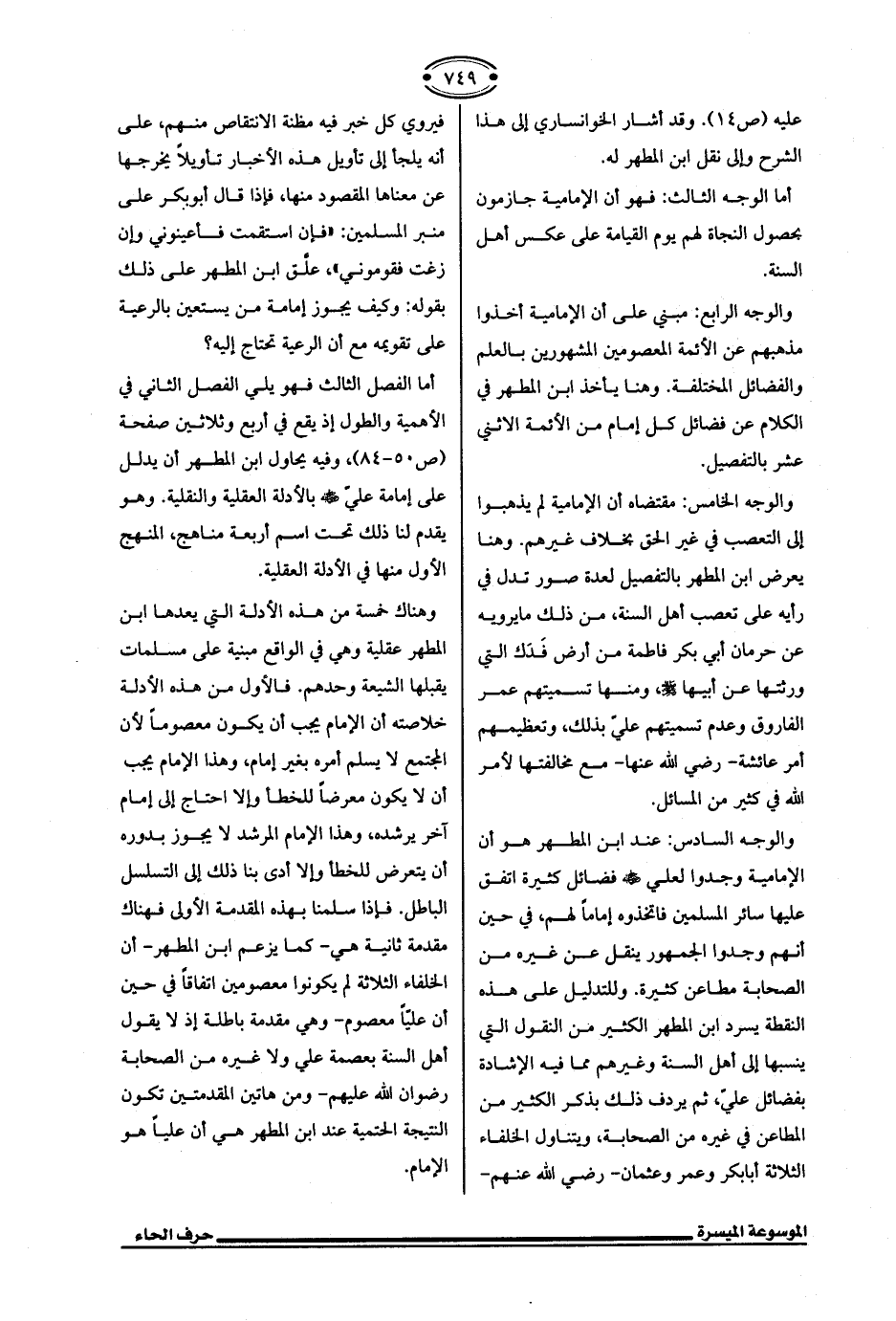 وهناك خمسة من هذه الأدلة التي يعدها ابن المطهر عقلية وهي في الواقع مبنية على مسلمات يقبلها الشيعة وحدهم. فالأول من هذه الأدلة خلاصته أن الإمام يجب أن يكون معصومًا لأن المجتمع لا يسلم أمره بغير إمام، وهذا الإمام يجب أن لا يكون معرضًا للخطأ وإلا احتاج إلى إمام آخر يرشده، وهذا الإمام المرشد لا يجوز بدوره أن يتعرض للخطأ وإلا أدى بنا ذلك إلى التسلسل الباطل. فإذا سلمنا بهذه المقدمة الأولى فهناك مقدمة ثانية هي -كما يزعم ابن المطهر- أن الخلفاء الثلاثة لم يكونوا معصومين اتفاقًا في حين أن عليًّا معصوم -وهي مقدمة باطلة إذ لا يقول أهل السنة بعصمة علي ولا غيره من الصحابة رضوان الله عليهم- ومن هاتين المقدمتين تكون النتيجة الحتمية عند ابن المطهر هي أن عليًّا هو الإمام.