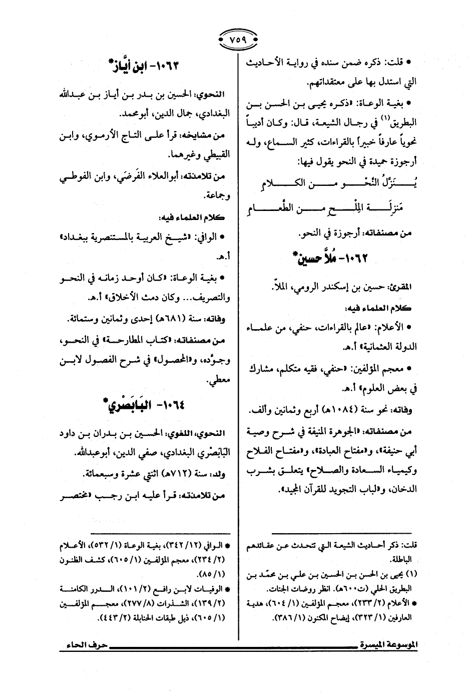 • بغية الوعاة: "ذكره يحيى بن الحسن بن البطريق (¬1) في رجال الشيعة، قال: وكان أديبًا نحويًا عارفًا خبيرًا بالقراءات، كثير السماع، وله أرجوزة حميدة في النحو يقول فيها: