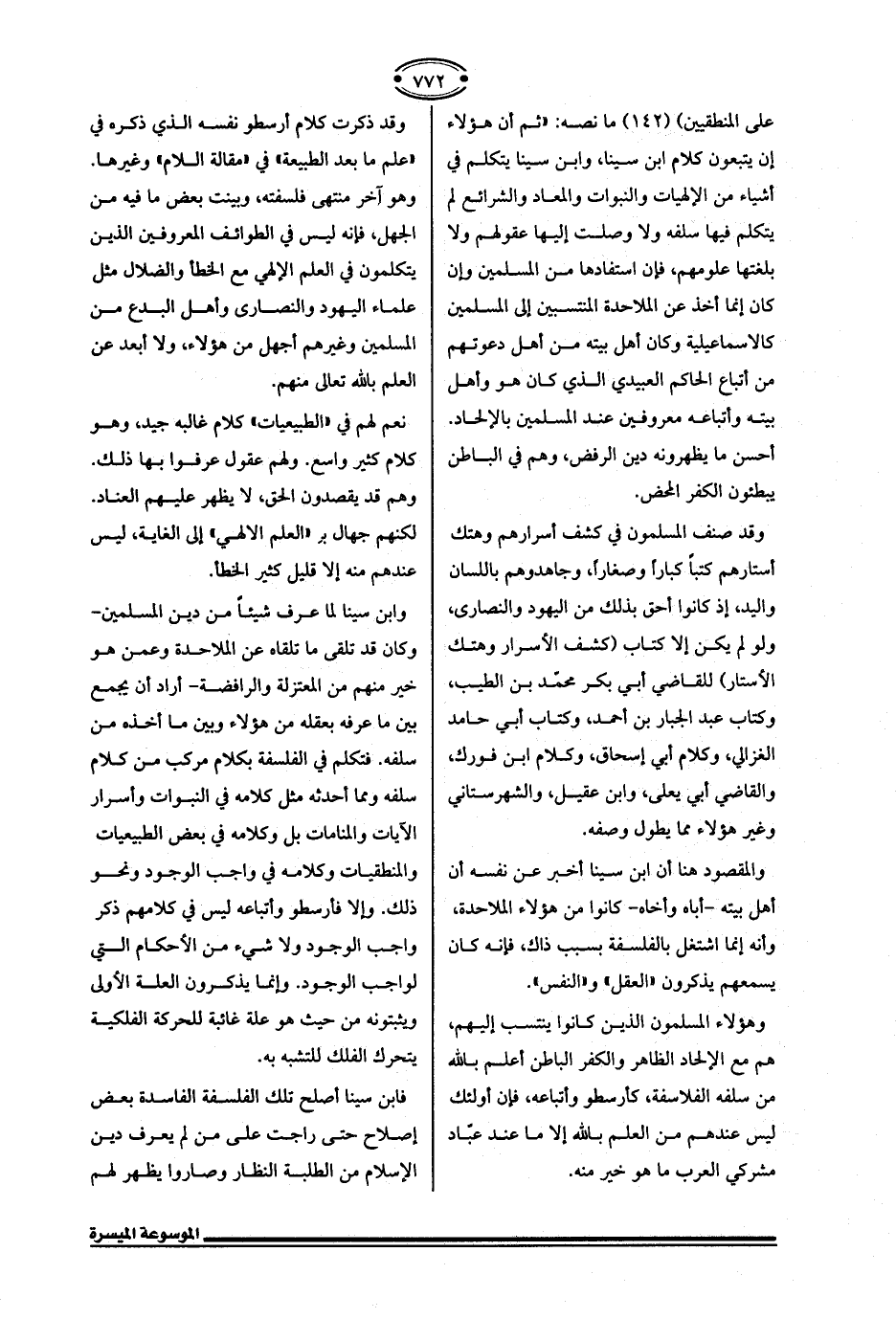 وقد ذكرت كلام أرسطو نفسه الذي ذكره في "علم ما بعد الطبيعة" في "مقالة اللام" وغيرها. وهو آخر منتهى فلسفته، وبينت بعض ما فيه من الجهل، فإنه ليس في الطوائف المعروفين الذين يتكلمون في العلم الإلهي مع الخطأ والضلال مثل علماء اليهود والنصارى وأهل البدع من المسلمين وغيرهم أجهل من هؤلاء، ولا أبعد عن العلم بالله تعالى منهم.