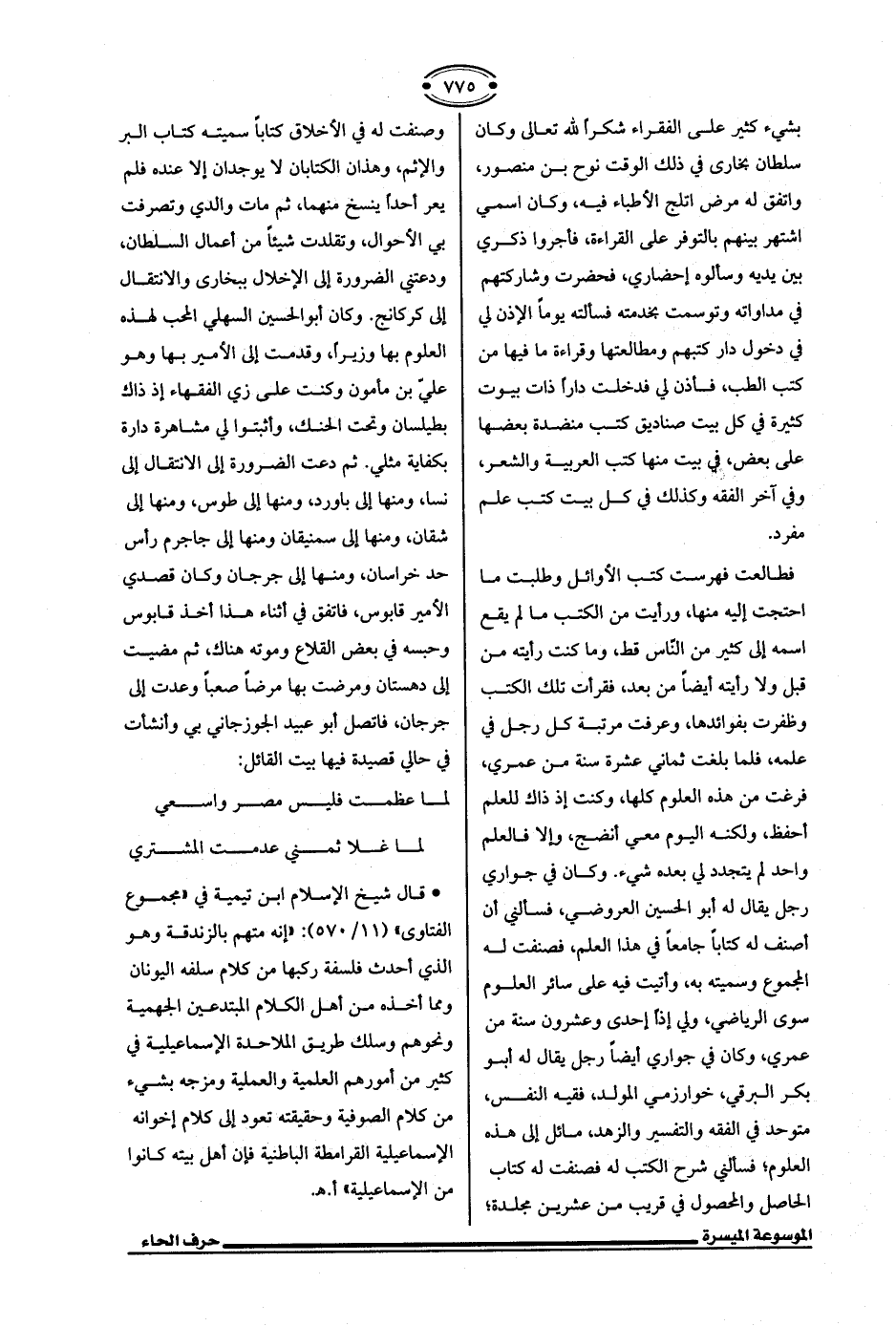 فطالعت فهرست كتب الأوائل وطلبت ما احتجت إليه منها، ورأيت من الكتب ما لم يقع اسمه إلى كثير من الناس قط، وما كنت رأيته من قبل ولا رأيته أيضًا من بعد، فقرأت تلك الكتب وظفرت بفوائدها، وعرفت مرتبة كل رجل في علمه، فلما بلغت ثماني عشرة سنة من عمري، فرغت من هذه العلوم كلها، وكنت إذ ذاك للعلم أحفظ، ولكنه اليوم معي أنضج، وإلا فالعلم واحد لم يتجدد لي بعده شيء. وكان في جواري رجل يقال له أبو الحسين العروضي، فسألني أن أصنف له كتابًا جامعًا في هذا العلم، فصنفت له المجموع وسميته به، وأتيت فيه على سائر العلوم سوى الرياضي، ولي إذًا إحدى وعشرون سنة من عمري، وكان في جواري أيضًا رجل يقال له أبو بكر البرقي، خوارزمي المولد، فقيه النفس، متوحد في الفقه والتفسير والزهد، مائل إلى هذه العلوم؛ فسألني شرح الكتب له فصنفت له كتاب الحاصل والمحصول في قريب من عشرين مجلدة؛ وصنفت له في الأخلاق كتابًا سميته كتاب البر والإثم، وهذان الكتابان لا يوجدان إلا عنده فلم يعر أحدًا ينسخ منهما، ثم مات والدي وتصرفت بي الأحوال، وتقلدت شيئًا من أعمال السلطان، ودعتني الضرورة إلى الإخلال ببخارى والانتقال إلى كركانج. وكان أبو الحسين السهلي المحب لهذه العلوم بها وزيرًا، وقدمت إلى الأمير بها وهو علي بن مأمون وكنت على زي الفقهاء إذ ذاك بطيلسان وتحت الحنك، وأثبتوا لي مشاهرة دارة بكفاية مثلي. ثم دعت الضرورة إلى الانتقال إلى نسا، ومنها إلى باورد، ومنها إلى طوس، ومنها إلى شقان، ومنها إلى سمنيقان ومنها إلى جاجرم رأس حد خراسان، ومنها إلى جرجان وكان قصدي الأمير قابوس، فاتفق في أثناء هذا أخذ قابوس وحبسه في بعض القلاع وموته هناك، ثم مضيت إلى دهستان ومرضت بها مرضًا صعبًا وعدت إلى جرجان، فاتصل أبو عبيد الجوزجاني بي وأنشأت في حالي قصيدة فيها بيت القائل: