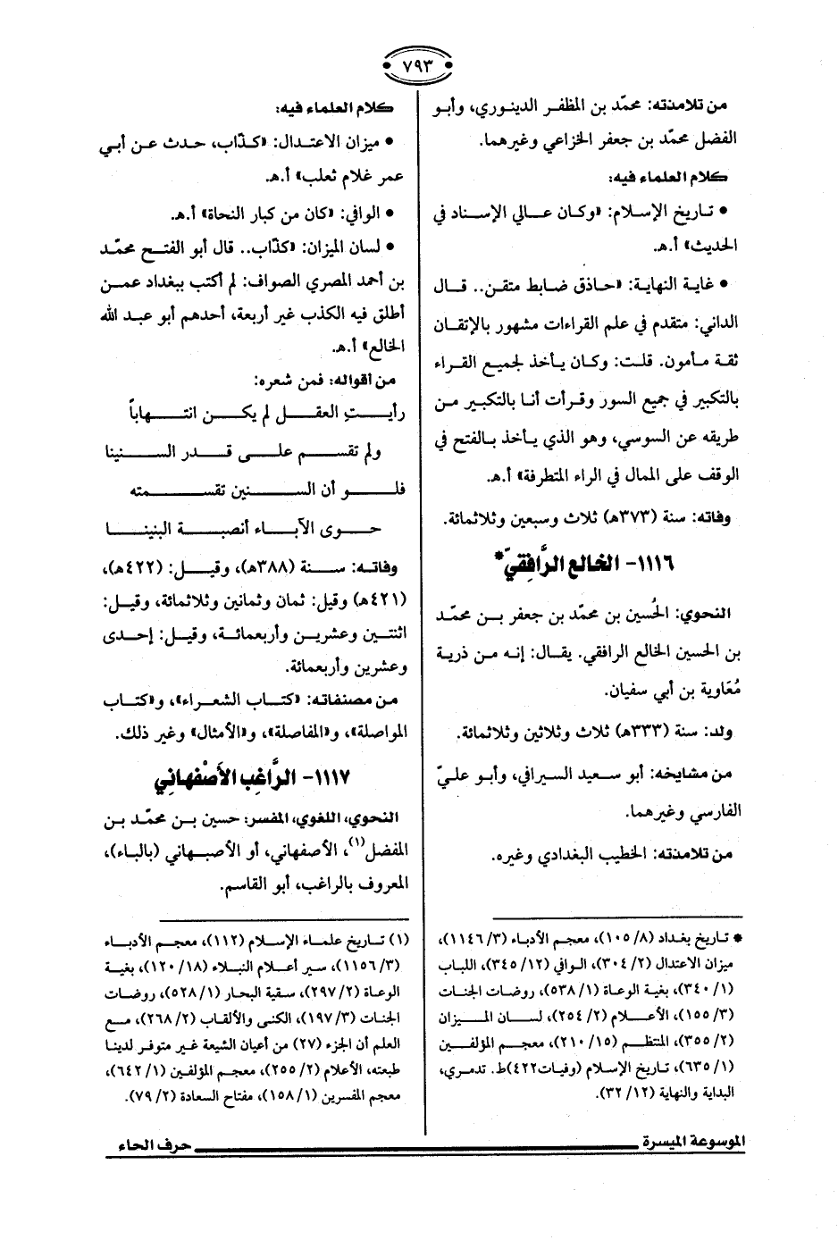 النحوي، اللغوي، المفسر: حسين بن محمّد بن المفضل (¬1)، الأصفهاني، أو الأصبهاني (بالباء)، المعروف بالراغب، أبو القاسم.