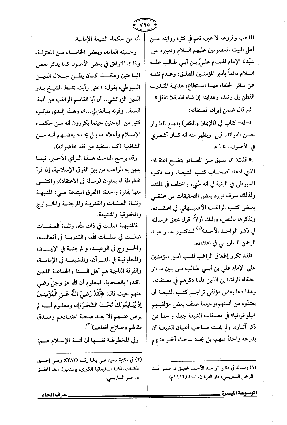 ونذكرها بالنص، وإليك أولًا: قول محقق "رسالته في ذكر الواحد الأحد" (¬1) للدكتور عمر عبد الرحمن الساريسي في اعتقاده: