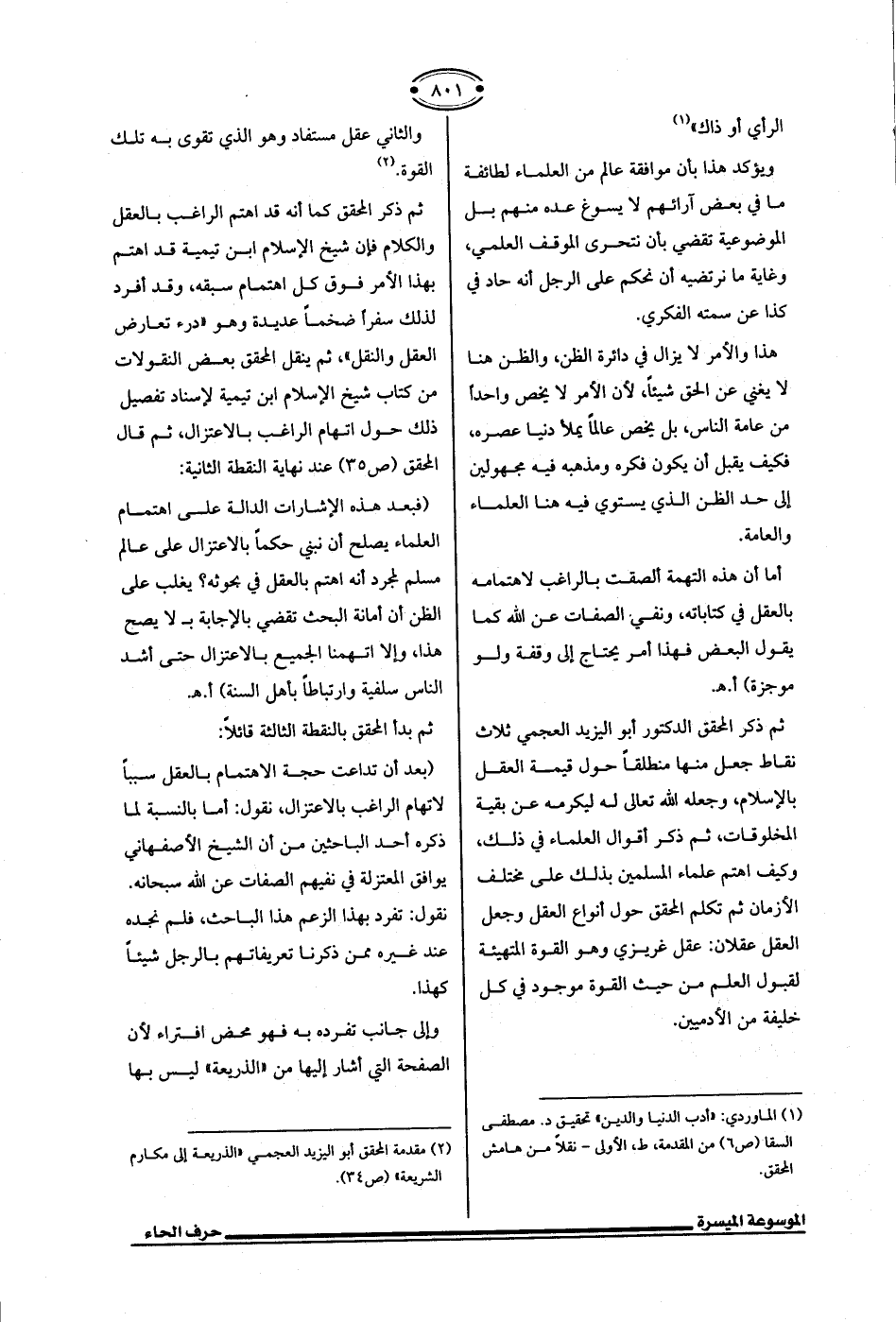 ثم ذكر المحقق كما أنه قد اهتم الراغب بالعقل والكلام فإن شيخ الإسلام ابن تيمية قد اهتم بهذا الأمر فوق كل اهتمام سبقه، وقد أفرد لذلك سفرًا ضخمًا عديدة وهو "درء تعارض العقل والنقل"، ثم ينقل المحقق بعض النقولات من كتاب شيخ الإسلام ابن تيمية لإسناد تفصيل ذلك حول اتهام الراغب بالاعتزال، ثم قال المحقق (ص 35) عند نهاية النقطة الثانية: