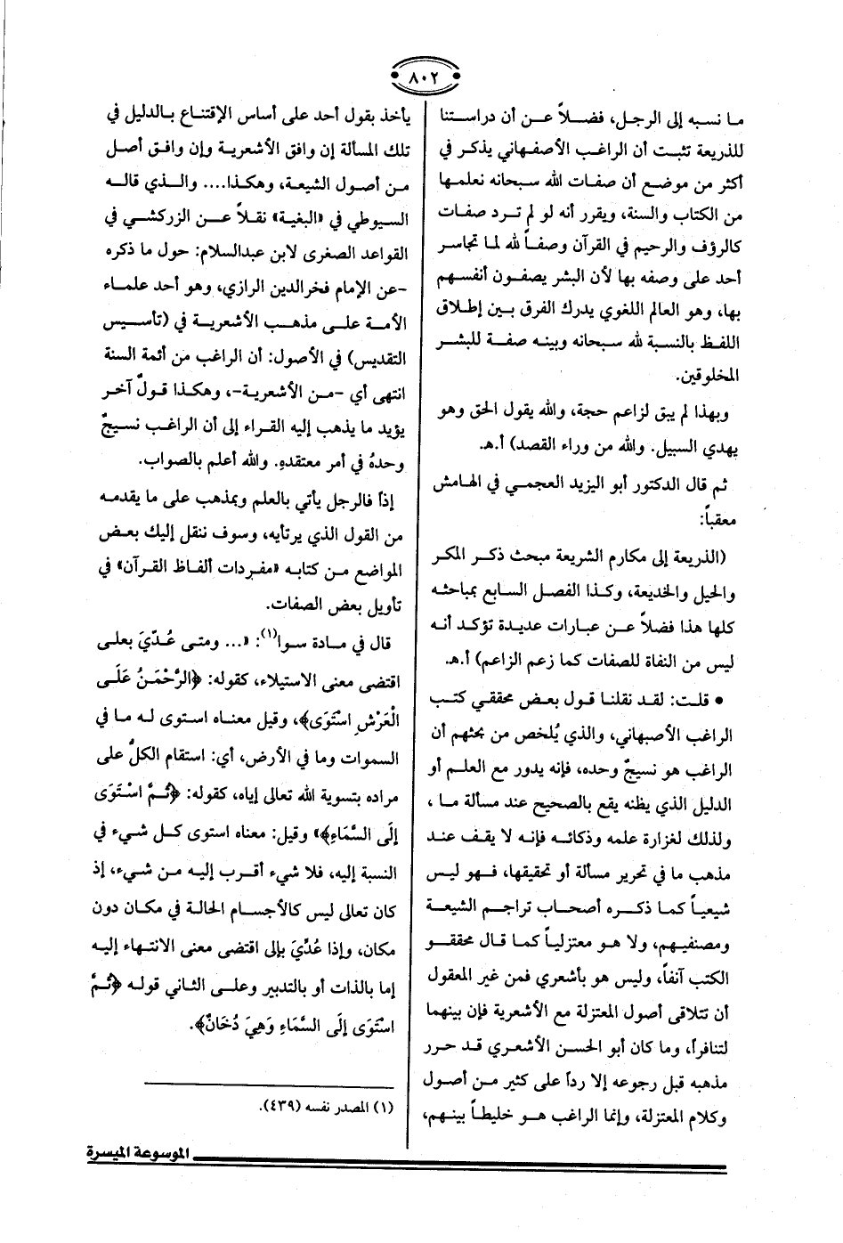 (الذريعة إلى مكارم الشريعة مبحث ذكر المكر والحيل والخديعة، وكذا الفصل السابع بمباحثه كلها هذا فضلًا عن عبارات عديدة تؤكد أنه ليس من النفاة للصفات كما زعم الزاعم) أ. هـ.
