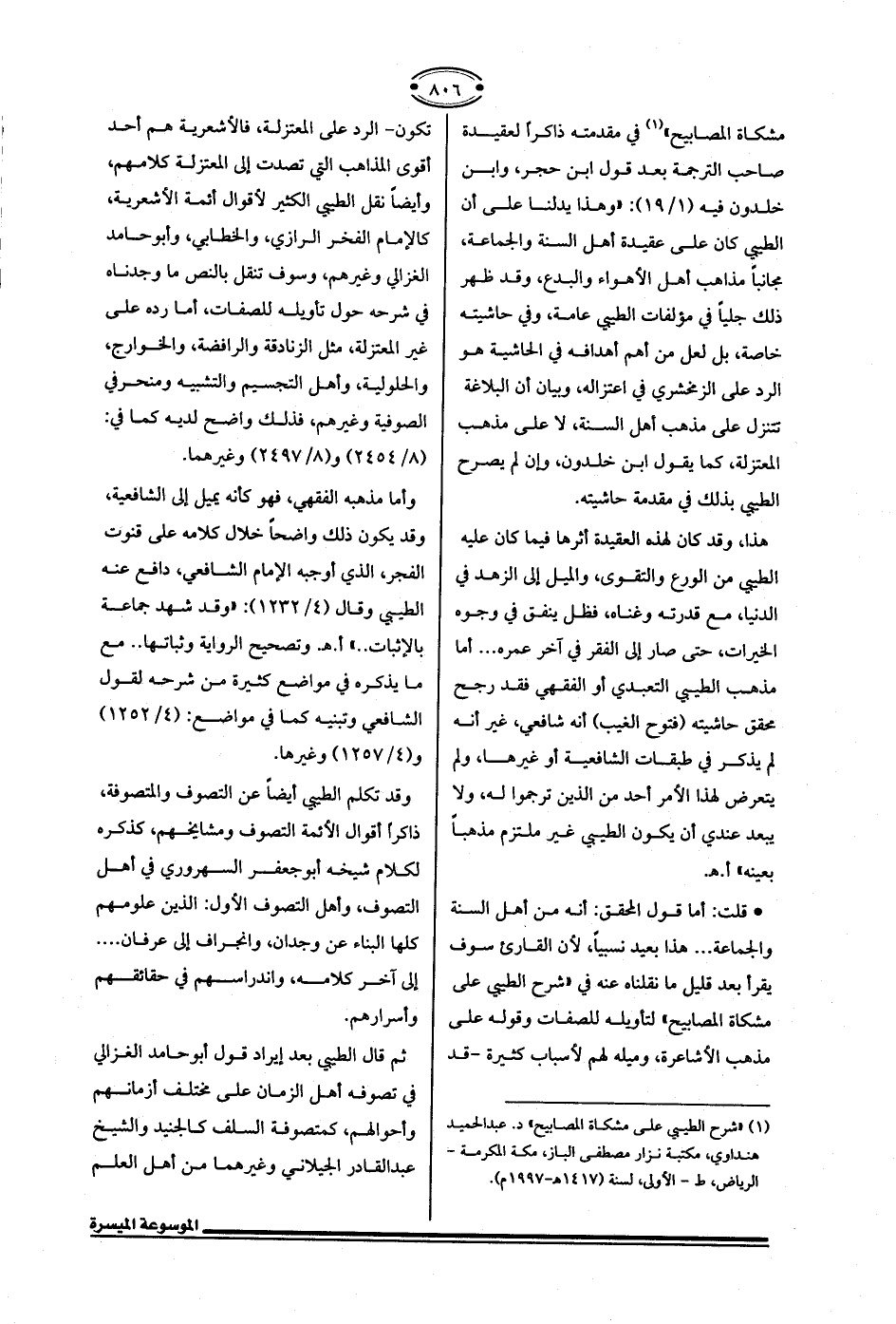 * قلت: أما قول المحقق: أنه من أهل السنة والجماعة ... هذا بعيد نسبيًا، لأن القارئ سوف يقرأ بعد قليل ما نقلناه عنه في "شرح الطيبي على مشكاة المصابيح" لتأويله للصفات وقوله على مذهب الأشاعرة، وميله لهم لأسباب كثيرة -قد تكون- الرد على المعتزلة، فالأشعرية هم أحد أقوى المذاهب التي تصدت إلى المعتزلة كلامهم، وأيضًا نقل الطيبي الكثير لأقوال أئمة الأشعرية، كالإمام الفخر الرازي، والخطابي، وأبوحامد الغزالي وغيرهم، وسوف تنقل بالنص ما وجدناه في شرحه حول تأويله للصفات، أما رده على غير المعتزلة، مثل الزنادقة والرافضة، والخوارج، والحلولية، وأهل التجسيم والتشبيه ومنحرفي الصوفية وغيرهم، فذلك واضح لديه كما في: (8/ 2454) و (8/ 2497) وغيرهما.