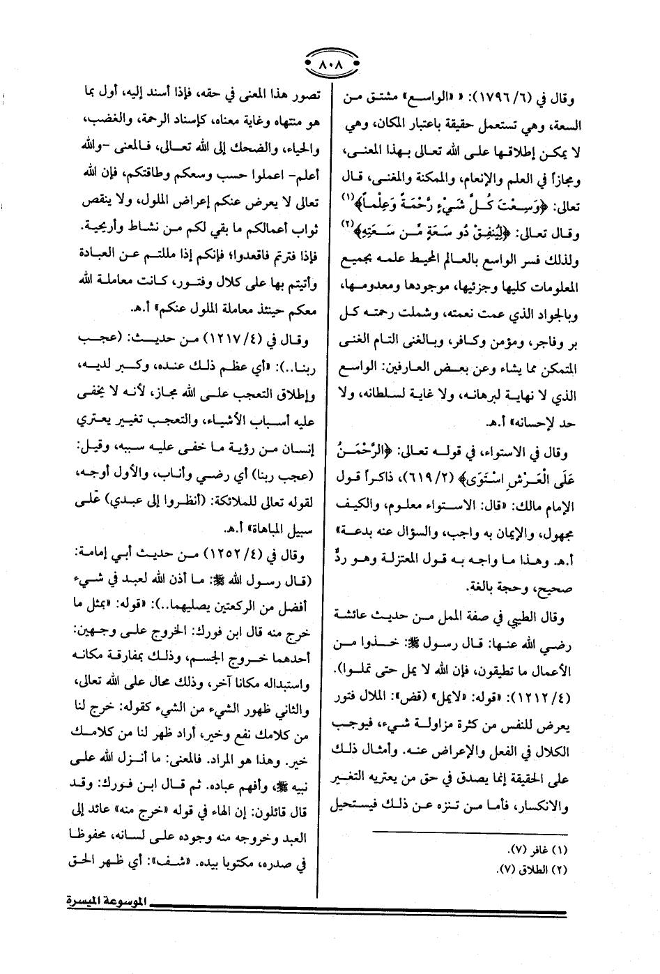 وقال في (6/ 1796): ""الواسع" مشتق من السعة، وهي تستعمل حقيقة باعتبار المكان، وهي لا يمكن إطلاقها على الله تعالى بهذا المعنى، ومجازًا في العلم والإنعام، والممكنة والمغني، قال تعالى: {وَسِعْتَ كُلَّ شَيءٍ رَحْمَةً وَعِلْمًا} (¬1) وقال تعالى: {لِيُنْفِقْ ذُو سَعَةٍ مِنْ سَعَتِهِ} (¬2) ولذلك فسر الواسع بالعالم المحيط علمه بجميع المعلومات كليها وجزئيها، موجودها ومعدومها، وبالجواد الذي عمت نعمته، وشملت رحمته كل بر وفاجر، ومؤمن وكافر، وبالغنى التام الغنى المتمكن مما يشاء وعن بعض العارفين: الواسع الذي لا نهاية لبرهانه، ولا غاية لسلطانه، ولا حد لإحسانه" أ. هـ.