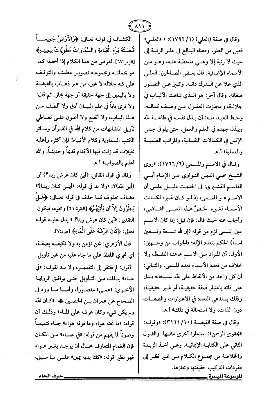 وقال في صفة (العلي) (6/ 1792): ""العلي" فعيل من العلو، ومعناه البالغ في علو الرتبة إلى حيث لا رتبة إلا وهي منحطة عنه، وهو من الأسماء الإضافية. قال بعض الصالحين: العلي الذي علا عن الدرك ذاته، وكبر عن التصور صفاته. وقال آخر: هو الذي تاهت الألباب في جلاله، وعجزت العقول عن وصف كماله. وحظ العبد منه: أن يذل نفسه في طاعة الله ويبذل جهده في العلم والعمل، حتى يفوق جنس الإنس في الكمالات النفسانية، والمراتب العلمية والعملية" أ. هـ.