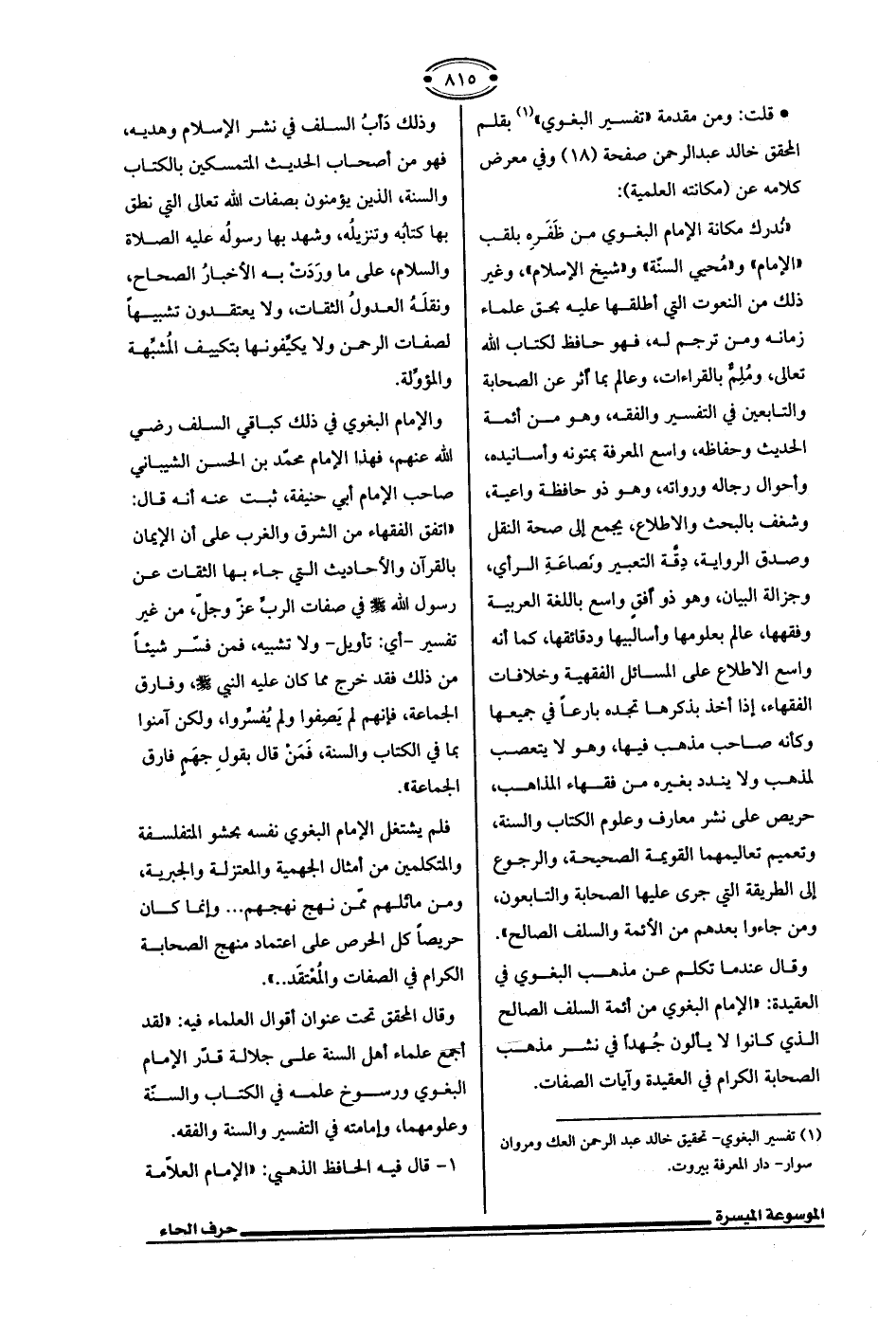 * قلت: ومن مقدمة "تفسير البغوي" (¬1) بقلم المحقق خالد عبد الرحمن صفحة (18) وفي معرض كلامه عن (مكانته العلمية):