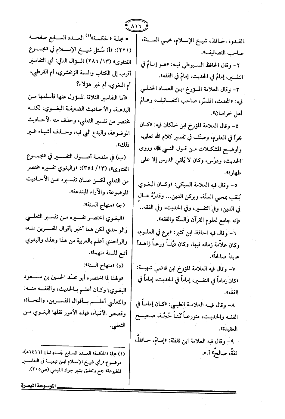 (¬1) مجلة "الحكمة" العدد السابع جماد ثان (1416 هـ)، موضوع "رأي شيخ الإسلام ابن تيمية في التفاسير المطبوعة" جمع وتعليق بشير جواد القيسي (ص 205).