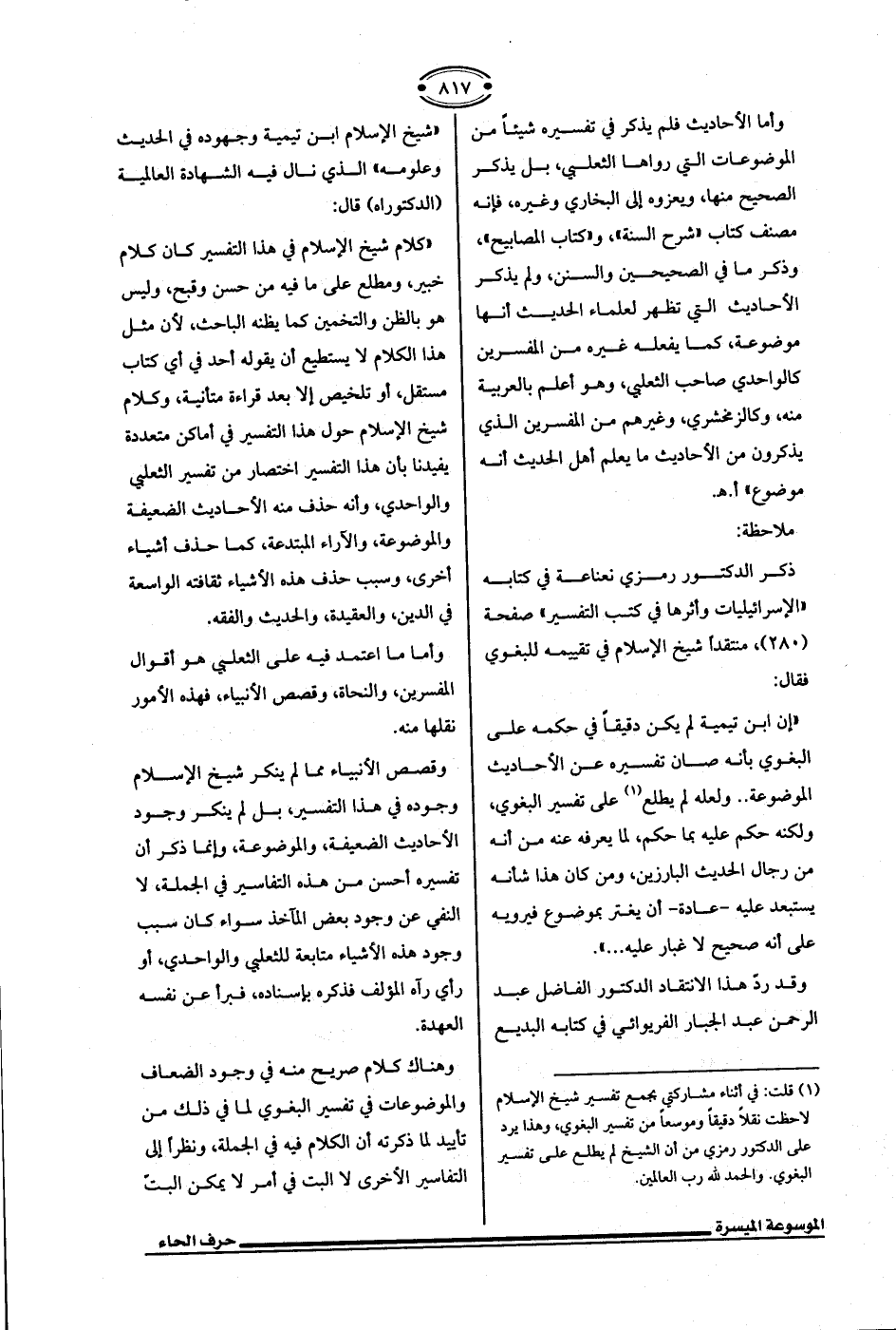 (¬1) قلت: في أثناء مشاركتي بجمع تفسير شيخ الإسلام لاحظت نقلًا دقيقًا وموسعًا من تفسير البغوي، وهذا يرد على الدكتور رمزي من أن الشيخ لم يطلع على تفسير البغوى. والحمد لله رب العالمين.