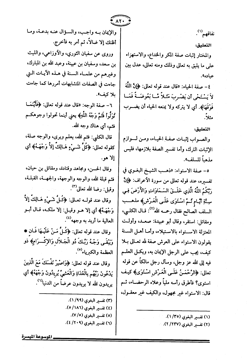 5 - صفة الاستواء: "ذهب الشيخ البغوي في تفسيره، عند قوله تعالى من سورة الأعراف: {إِنَّ رَبَّكُمُ اللَّهُ الَّذِي خَلَقَ السَّمَاوَاتِ وَالْأَرْضَ فِي سِتَّةِ أَيَّامٍ ثُمَّ اسْتَوَى عَلَى الْعَرْشِ} مذهب السلف الصالح فقال رحمه الله (¬2): قال الكلبي، ومقاتل: استقر، وقال أبو عبيدة: صعد، وأولت المعتزلة الاستواء بالاستيلاء، وأما أهل السنة يقولون الاستواء على العرش صفة لله تعالى بلا كيف، يجب على الرجل الإيمان به، ويكل العلم فيه إلى الله عزَّ وجلَّ، وسأل رجل مالكًا عن قوله تعالى: {الرَّحْمَنُ عَلَى الْعَرْشِ اسْتَوَى} كيف استوى؟ فأطرق رأسه مليًا وعلاه الرحضاء، ثم قال: الاستواء غير مجهول، والكيف غير معقول، والإيمان به واجب، والسؤال عنه بدعة، وما أظنك إلا ضالًا، ثم أمر به فأخرج.