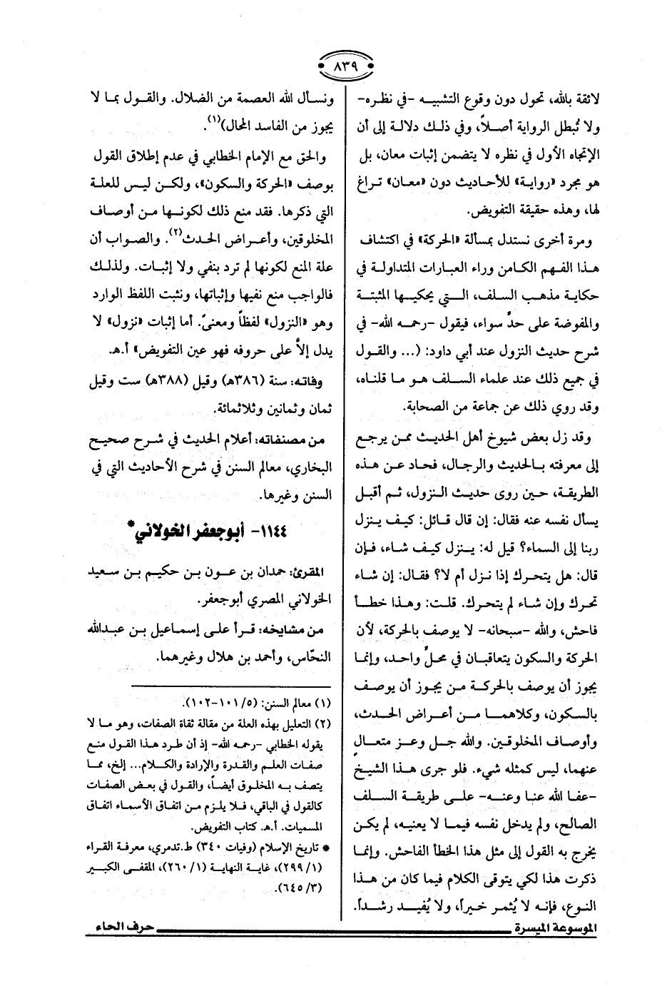 (¬2) التعليل بهذه العلة من مقالة ثقاة الصفات، وهو ما لا يقوله الخطابي -رحمه الله- إذ أن طرد هذا القول منع صفات العلم والقدرة والإرادة والكلام ... الخ، مما يتصف به المخلوق أيضًا، والقول في بعض الصفات كالقول في الباقي، فلا يلزم من اتفاق الأسماء اتفاق المسميات. أ. هـ. كتاب التفويض.