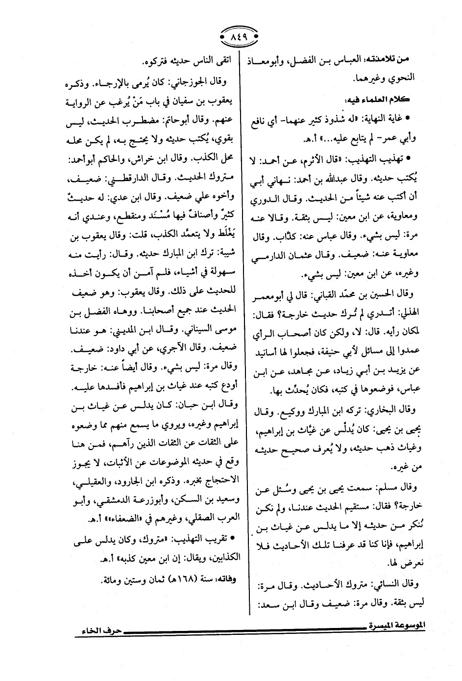 • تقريب التهذيب: "متروك، وكان يدلس على الكذابين، ويقال: إن ابن معين كذبه" أ. هـ.