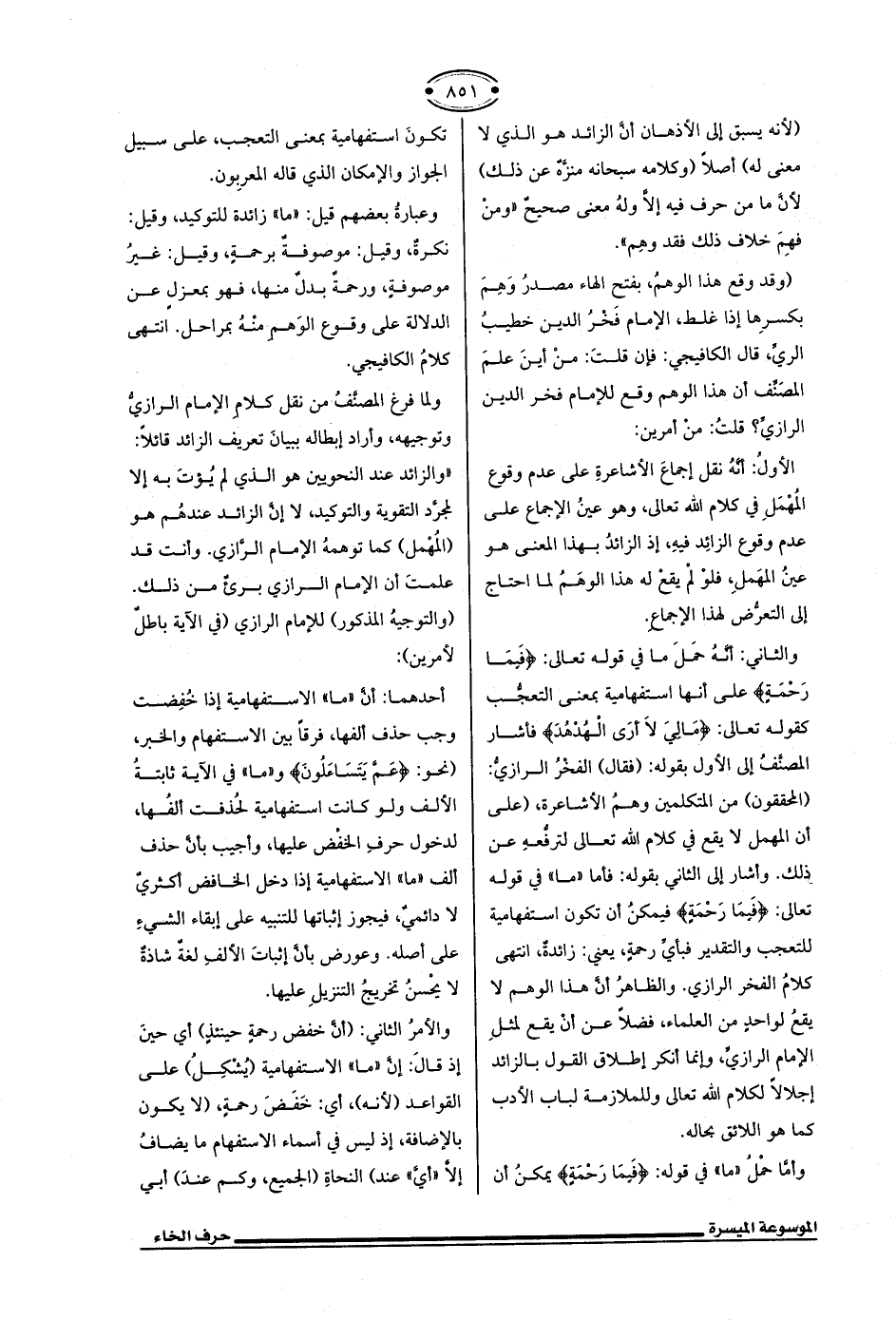 والثاني: أنَّهُ حمَلَ ما في قوله تعالى: {فَبِمَا رَحْمَةٍ} على أنها استفهامية بمعنى التعجُّب كقوله تعالى: {مَا لِيَ لَا أَرَى الْهُدْهُدَ} فأشار المصنَّفُ إلى الأول بقوله: (فقال) الفخْرُ الرازيُّ: (المحققون) من المتكلمين وهمُ الأشاعرة، (على أن المهمل لا يقع في كلام الله تعالى لترفُّعهِ عن ذلك. وأشار إلى الثاني بقوله: فأما "ما" في قوله تعالى: {فَبِمَا رَحْمَةٍ} فيمكنُ أن تكون استفهامية للتعجب والتقدير فبأيِّ رحمةٍ، يعني: زائدةٌ، انتهى كلامُ الفخر الرازي. والظاهرُ أنَّ هذا الوهم لا يقعُ لواحدٍ من العلماء، فضلًا عن أنْ يقع لمثلِ الإمام الرازيِّ، وإنما أنكر إطلاق القول بالزائد إجلالًا لكلام الله تعالى وللملازمة لباب الأدب كما هو اللائق بحاله.