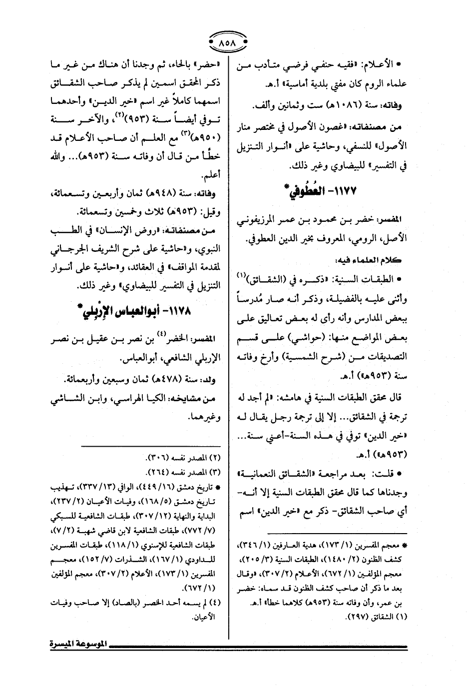 • قلت: بعد مراجعة "الشقائق النعمانية" وجدناها كما قال محقق الطبقات السنية إلا أنه -أي صاحب الشقائق- ذكر مع "خير الدين" اسم "حضر" بالحاء، ثم وجدنا أن هناك من غير ما ذكر المحقق اسمين لم يذكر صاحب الشقائق اسمهما كاملًا غير اسم "خير الدين" وأحدهما توفي أيضًا سنة (953) (¬2)، والآخر سنة (950 هـ) (¬3) مع العلم أن صاحب الأعلام قد خطأ من قال أن وفاته سنة (953 هـ) ... والله أعلم.
