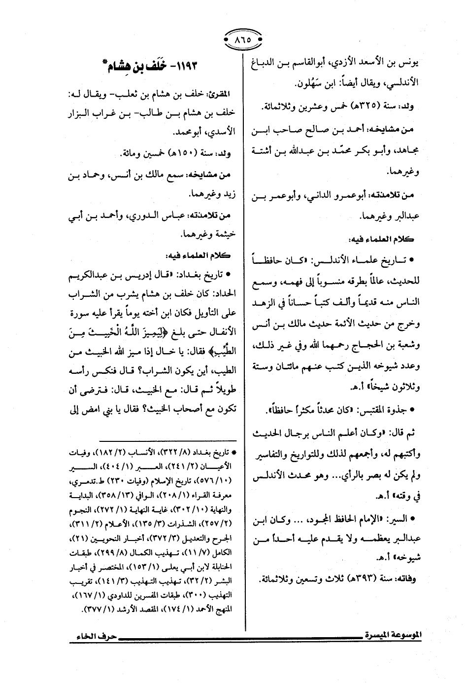 • تاريخ بغداد: "قال إدريس بن عبد الكريم الحداد: كان خلف بن هشام يشرب من الشراب على التأويل فكان ابن أخته يومًا يقرأ عليه سورة الأنفال حتى بلغ {لِيَمِيزَ اللَّهُ الْخَبِيثَ مِنَ الطَّيِّبِ} فقال: يا خال إذا ميز الله الخبيث من الطيب، أين يكون الشراب؟ قال فنكس رأسه طويلًا ثم قال: مع الخبيث، قال: فترضى أن تكون مع أصحاب الخبيث؟ فقال يا بني امض إلى