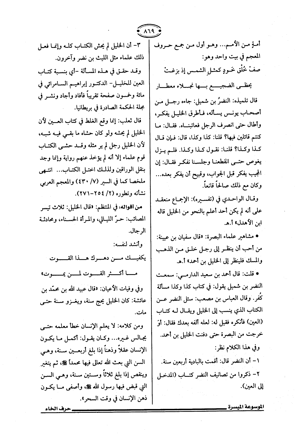 وقد حقق في هذه المسألة -أي بنسبة كتاب العين للخليل- الدكتور إبراهيم السامرائي في مائة وخمسون صفحة تقريبًا فأفاد وأجاد ونشر في مجلة الحكمة الصادرة في بريطانيا.