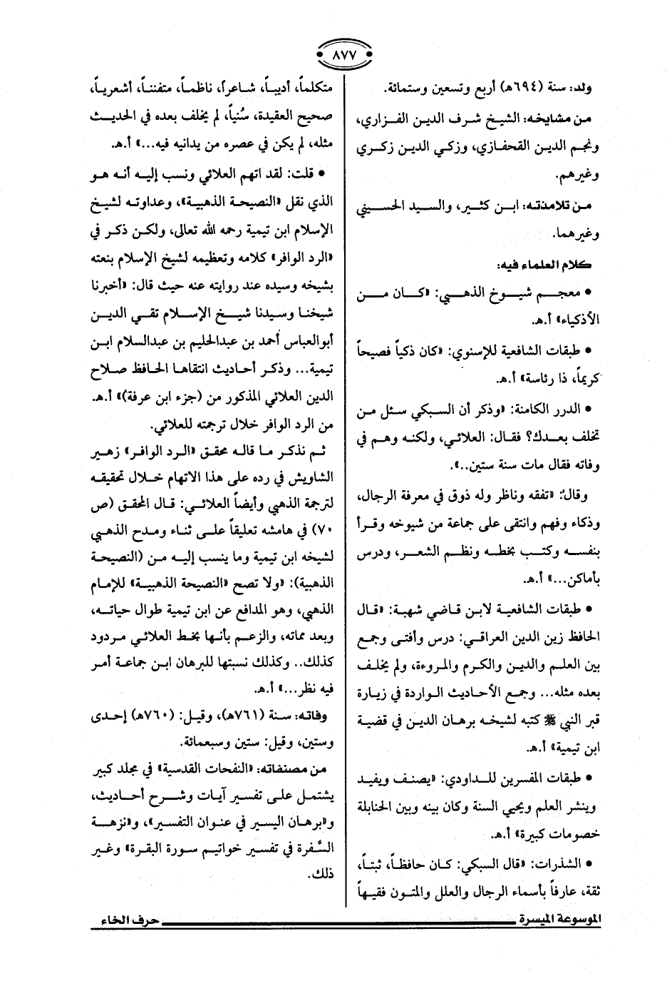 • قلت: لقد اتهم العلائي ونسب إليه أنه هو الذي نقل "النصيحة الذهبية"، وعداوته لشيخ الإسلام ابن تيمية رحمه الله تعالى، ولكن ذكر في "الرد الوافر" كلامه وتعظيمه لشيخ الإسلام بنعته بشيخه وسيده عند روايته عنه حيث قال: "أخبرنا شيخنا وسيدنا شيخ الإسلام تقي الدين أبو العباس أحمد بن عبد الحليم بن عبد السلام ابن تيمية ... وذكر أحاديث انتقاها الحافظ صلاح الدين العلائي المذكور من (جزء ابن عرفة) " أ. هـ. من الرد الوافر خلال ترجمته للعلائي.