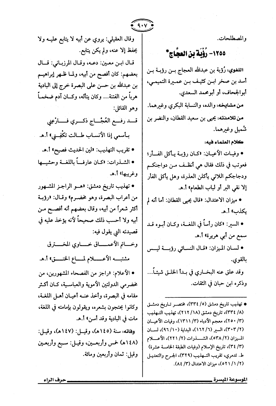 * تهذيب تاريخ دمشق: "هو الراجز المشهور من أعراب البصرة، وهو مخضرم" وقال: "رؤبة أكثر شعرًا من أبيه، وقال بعضهم أنه أفصح من أبيه ولا أحسب ذلك صحيحًا لأنه يؤخذ عليه في قصيدته التي يقول فيه:
