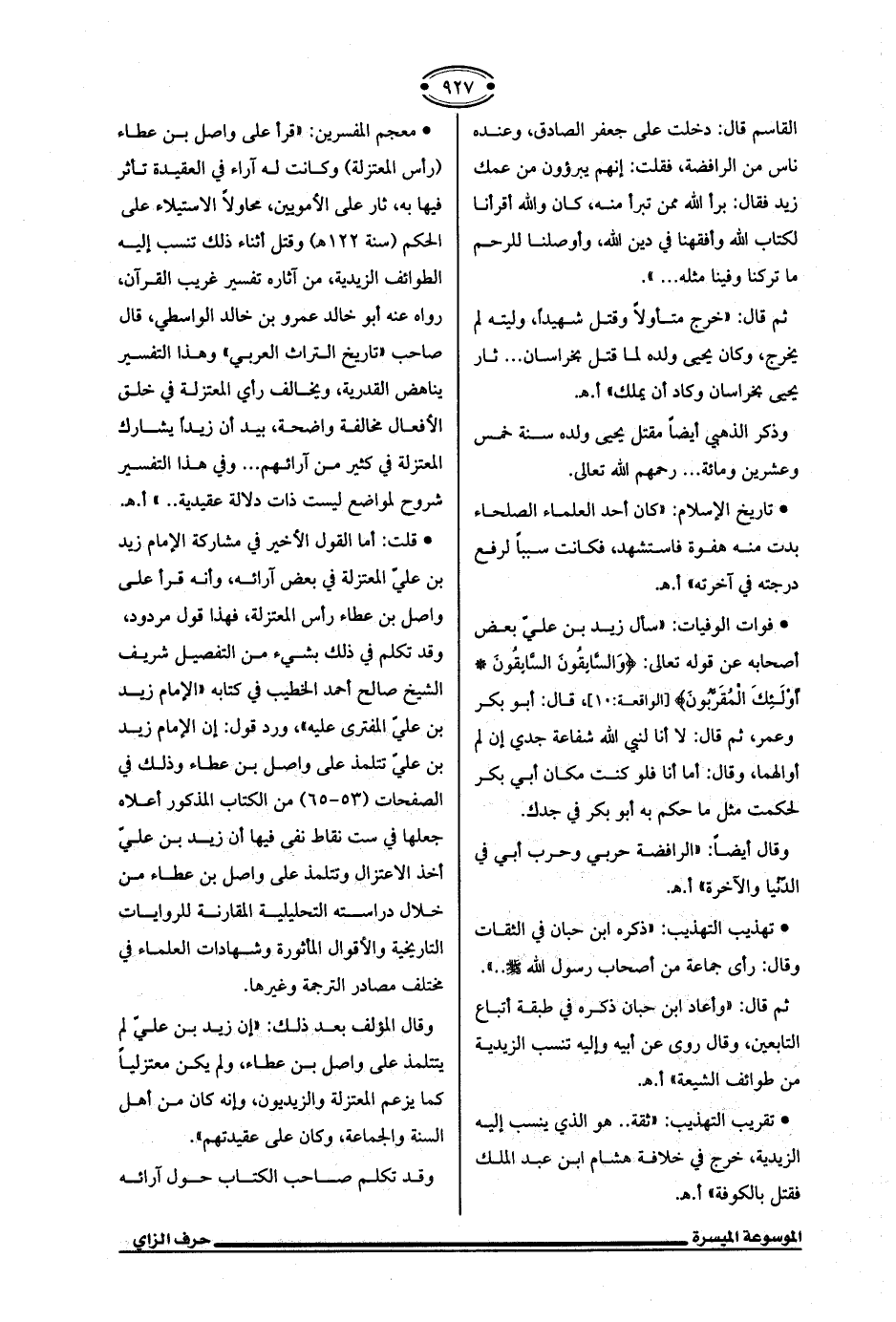 وقال المؤلف بعد ذلك: "إن زيد بن عليّ لم يتتلمذ على واصل بن عطاء، ولم يكن معتزليًا كما يزعم المعتزلة والزيديون، وإنه كان من أهل السنة والجماعة، وكان على عقيدتهم".