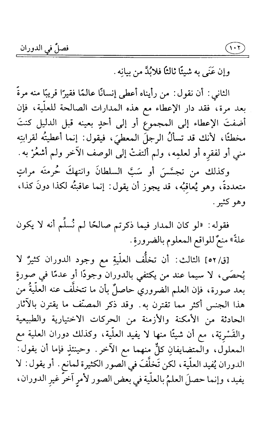الثاني أن نقول من رأيناه أعطى إنسانًا عالمًا فقيرًا قريبًا منه مرةً بعد مرة فقد دار الإعطاء مع هذه المدارات الصالحة للعلّية فإن أضفتَ الإعطاء إلى المجموع أو إلى أحدٍ بعينه قبل الدليل كنتَ مخطئًا لأنك قد تسألُ الرجلَ المعطيَ فيقول إنما أعطيتُه لقرابتِه مني أو لفقرِه أو لعلمِه ولم ألتفتْ إلى الوصف الآخر ولم أشعُرْ به