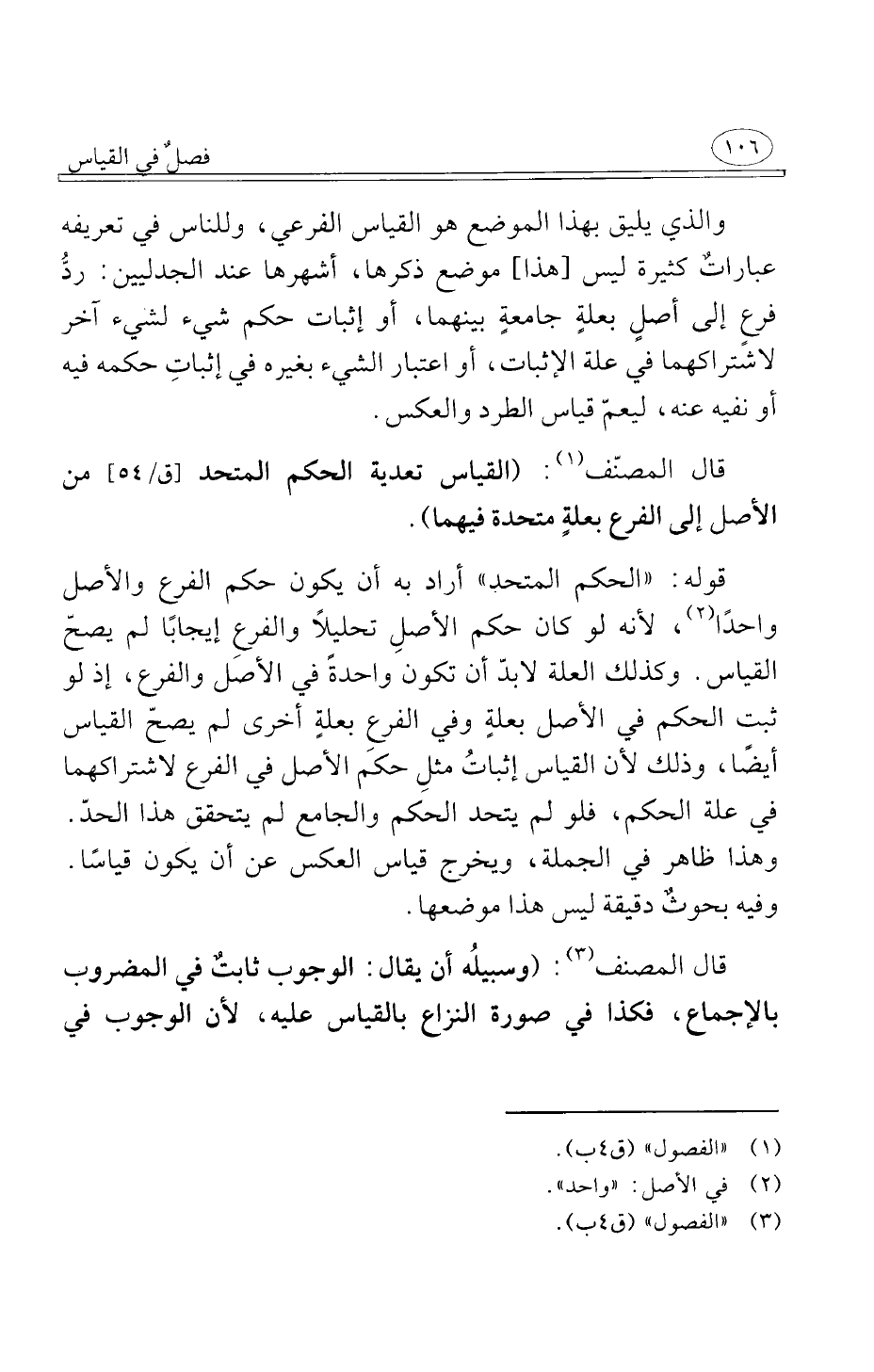قال المصنّف القياس تعدية الحكم المتحد من الأصل إلى الفرع بعلةٍ متحدة فيهما