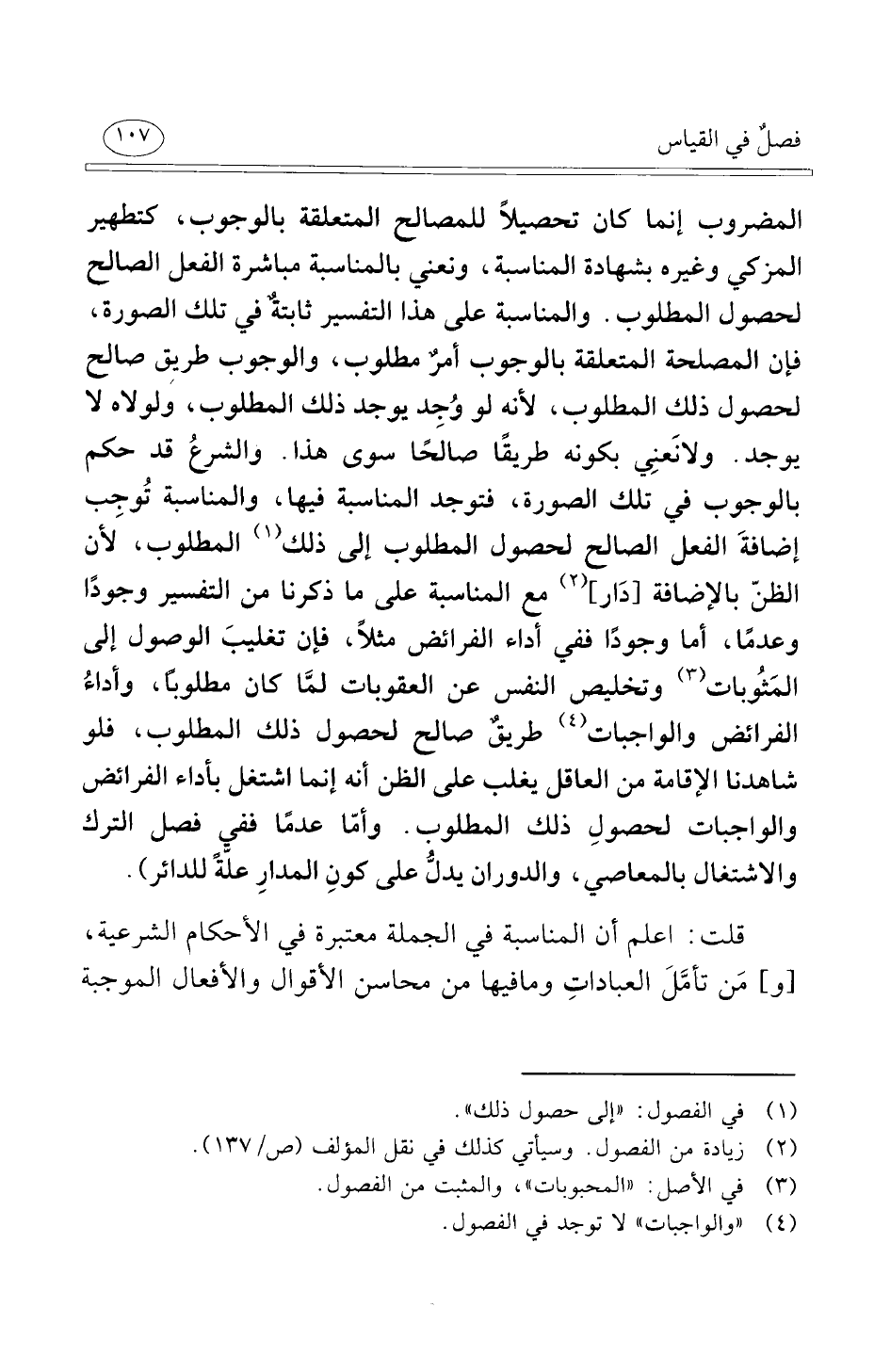 المضروب إنما كان تحصيلاً للمصالح المتعلقة بالوجوب كتطهير المزكي وغيره بشهادة المناسبة ونعني بالمناسبة مباشرة الفعل الصالح لحصول المطلوب والمناسبة على هذا التفسير ثابتةٌ في تلك الصورة فإن المصلحة المتعلقة بالوجوب أمرٌ مطلوب والوجوب طريق صالح لحصول ذلك المطلوب لأنه لو وُجِد يوجد ذلك المطلوب ولولاه لا يوجد ولا نَعنِي بكونه طريقًا صالحًا سوى هذا والشرعُ قد حكم بالوجوب في تلك الصورة فتوجد المناسبة فيها والمناسبة تُوجِب إضافةَ الفعل الصالح لحصول المطلوب إلى ذلك المطلوب لأن الظنّ بالإضافة دَار مع المناسبة على ما ذكرنا من التفسير وجودًا وعدمًا أما وجودًا ففي أداء الفرائض مثلاً فإن تغليبَ الوصول إلى المَثُوبات وتخليص النفس عن العقوبات لمَّا كان مطلوبًا وأداءُ الفرائض والواجبات طريقٌ صالح لحصول ذلك المطلوب فلو شاهدنا الإقامة من العاقل يغلب على الظن أنه إنما اشتغل بأداء الفرائض والواجبات لحصولِ ذلك المطلوب وأمّا عدمًا ففي فصل الترك والاشتغال بالمعاصي والدوران يدلُّ على كونِ المدارِ علّةً للدائر