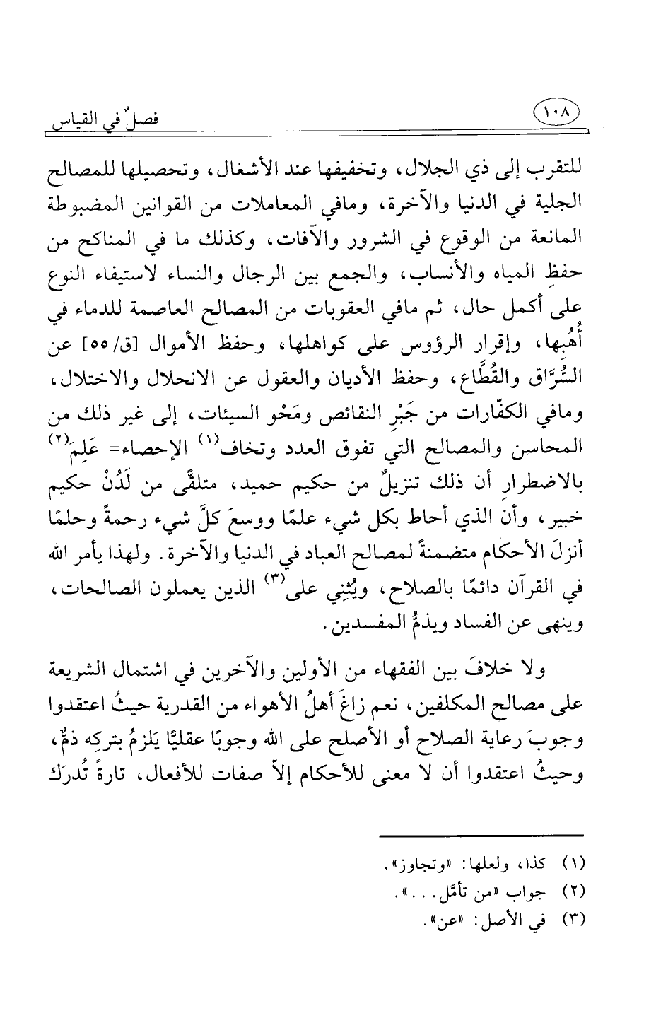 ولا خلافَ بين الفقهاء من الأولين والآخرين في اشتمال الشريعة على مصالح المكلفين نعم زاغَ أهلُ الأهواء من القدرية حيثُ اعتقدوا وجوبَ رعاية الصلاح أو الأصلح على الله وجوبًا عقليًّا يَلزمُ بتركِه ذمٌّ وحيثُ اعتقدوا أن لا معنى للأحكام إلاّ صفات للأفعال تارةً تُدرَك