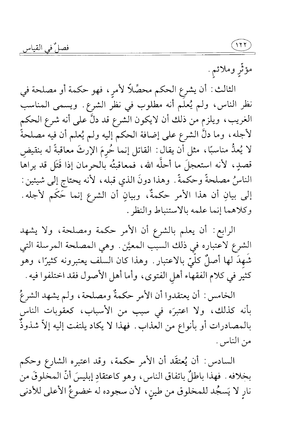 السادس أن يُعتقَد أن الأمر حكمة وقد اعتبره الشارع وحكم بخلافه فهذا باطلٌ باتفاق الناس وهو كاعتقادِ إبليسَ أنّ المخلوقَ من نارٍ لا يَسجُد للمخلوق من طينٍ لأن سجوده له خضوعُ الأعلى للأدنى