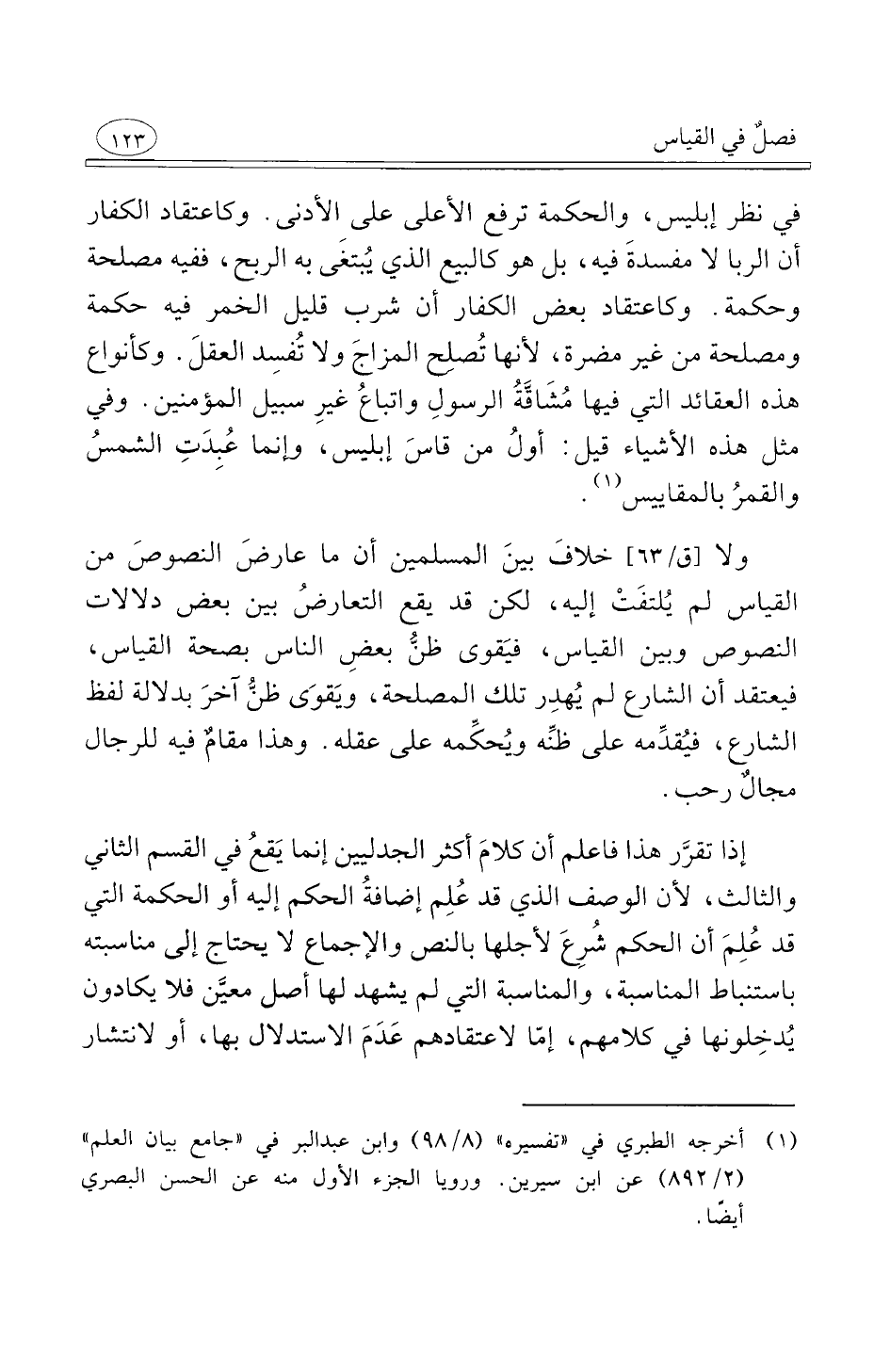 في نظر إبليس والحكمة ترفع الأعلى على الأدنى وكاعتقاد الكفار أن الربا لا مفسدةَ فيه بل هو كالبيع الذي يُبتَغى به الربح ففيه مصلحة وحكمة وكاعتقاد بعض الكفار أن شرب قليل الخمر فيه حكمة ومصلحة من غير مضرة لأنها تُصلِح المزاجَ ولا تُفسِد العقلَ وكأنواع هذه العقائد التي فيها مُشَاقَّةُ الرسولِ واتباعُ غيرِ سبيل المؤمنين وفي مثل هذه الأشياء قيل أولُ من قاسَ إبليس وإنما عُبِدَتِ الشمسُ والقمرُ بالمقاييس