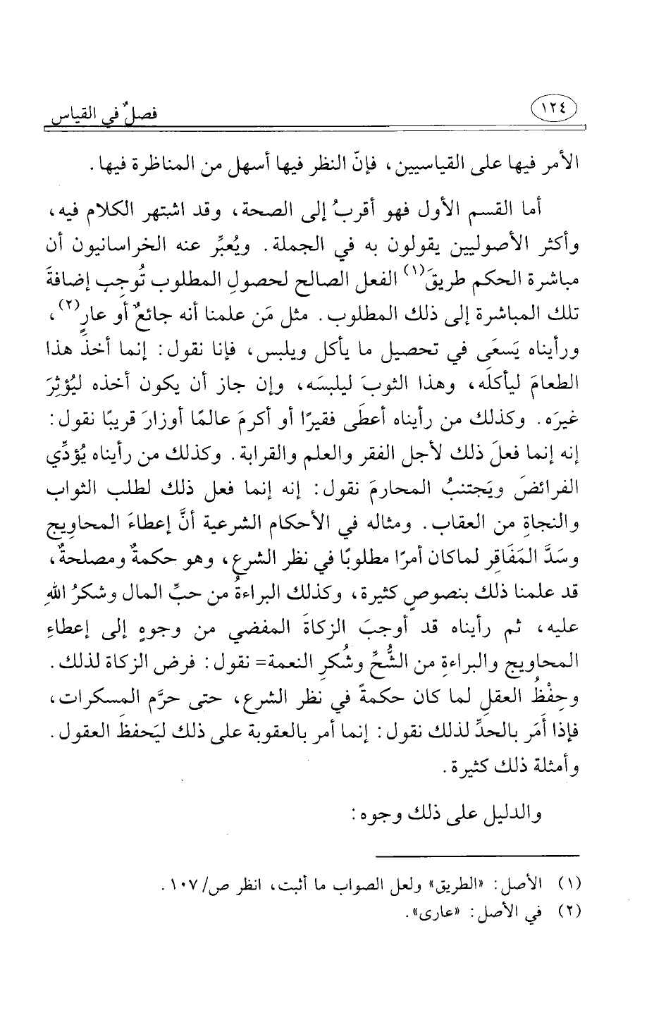 أما القسم الأول فهو أقرب إلى الصحة وقد اشتهر الكلام فيه وأكثر الأصوليين يقولون به في الجملة ويُعبِّر عنه الخراسانيون أن مباشرة الحكم طريقَ الفعل الصالح لحصولِ المطلوب تُوجِب إضافةَ تلك المباشرة إلى ذلك المطلوب مثل مَن علمنا انه جائعٌ أو عارٍ ورأيناه يَسعَى في تحصيل ما يأكل ويلبس فإنا نقول إنما أخذَ هذا الطعامَ ليأكلَه وهذا الثوبَ ليلبسَه وإن جاز أن يكون أخذه ليُؤثِرَ غيرَه وكذلك من رأيناه أعطَ فقيرًا أو أكرمَ عالمًا أو زارَ قريبًا نقول إنه فعل ذلك لأجل الفقر والعلم والقرابة وكذلك من رأيناه يُؤدِّي الفرائضَ ويَجتنبُ المحارمَ نقول إنه إنما فعل ذلك لطلب الثواب والنجاةِ من العقاب ومثاله في الأحكام الشرعية أنَّ إعطاءَ المحاوِيج وسَدَّ المَفَقِر لما كان أمرًا مطلوبًا في نظر الشرع وهو حكمةٌ ومصلحةٌ قد علمنا ذلك بنصوصٍ كثيرة وكذلك البراءةُ من حبِّ المال وشكرُ اللهِ عليه ثم رأيناه قد أوجبَ الزكاةَ المفضي من وجوهٍ إلى إعطاءِ المحاويج والبراءةِ من الشُّحِّ وشُكرِ النعمة نقول فرض الزكاة لذلك وحِفْظُ العقلِ لما كان حكمةً في نظر الشرع حتى حرَّم المسكرات فإذا أَمَر بالحدِّ لذلك نقول إنما أمر بالعقوبة على ذلك ليَحفظًَ العقول وأمثلة ذلك كثيرة