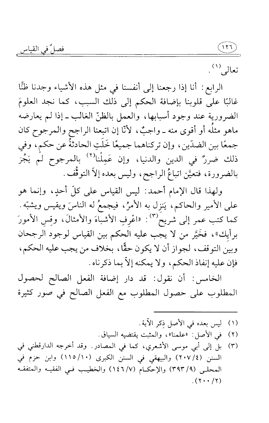 ولهذا قال الإمام أحمد ليس القياس على كلّ أحدٍ وإنما هو على الأمير والحاكم يَنزِل به الأمرُ فيجمعُ له الناسَ ويقيس ويشبّه كما كتب عمر إلى شريح اعْرِفِ الأشباهَ والمثالَ وقِسِ الأمورَ برأيِك فخَيَّر من لا يجب عليه الحكم بين القياس لوجود الرجحان وبين التوقف لجواز أن لا يكون حقًّا بخلاف من يجب عليه الحكم فإن عليه إنفاذ الحكم ولا يمكنه إلاّ بما ذكرناه