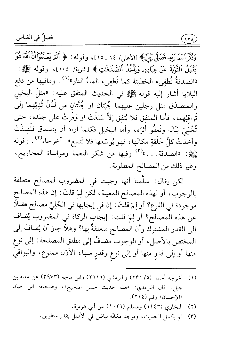 وَذَكَرَ اسْمَ رَبِّهِ فَصَلَّى (15) [الأعلى 14 - 15] وقوله أَلَمْ يَعْلَمُوا أَنَّ اللَّهَ هُوَ يَقْبَلُ التَّوْبَةَ عَنْ عِبَادِهِ وَيَأْخُذُ الصَّدَقَاتِ [التوبة 104] وقوله صلى الله عليه وسلم الصدقةُ تُطفِئ الخطيئة كما تُطفِئ الماءُ النار وما فيها من دفع البلايا أشار إليه قوله صلى الله عليه وسلم في الحديث المتفق عليه مثلُ البخيلِ والمتصدّق مثل رجلين عليهما جُبّتان أو جُنَّتانِ من لَدُنْ ثُدِيِّهما إلى تَراقِيْهما فأما المنفِق فلا يُنفِق إلاّ سَبَغَتْ أو وَفَرتْ على جلده حتى تُخْفِيَ بَنَانَه وتَعفُو أثرَه وأما البخيل فكلما أراد أن يتصدق فلَصِقَتْ وأخذتْ كلُّ حَلْقةٍ مكانَها فهو يُوسّعها فلا تَتسع أخرجاه وقوله صلى الله عليه وسلم الصدقة وفيها من شكر النعمة ومواساة المحاويج وغير ذلك من المصالح المطلوبة