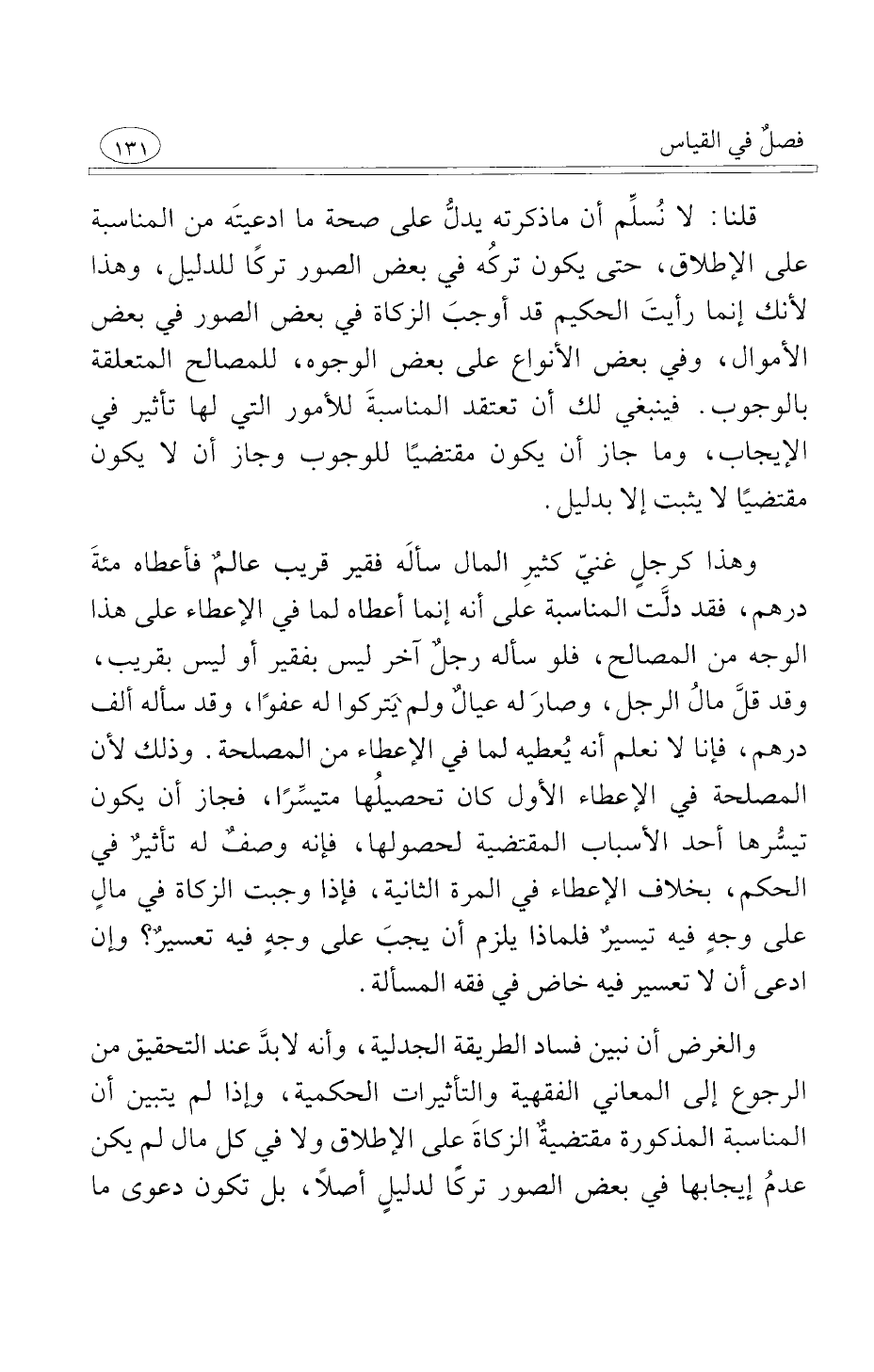 والغرض أن نبين فساد الطريقة الجدلية وأنه لابدَّ عند التحقيق من الرجوع إلى المعاني الفقهية والتأثيرات الحكمية وإذا لم يتبين أن المناسبة المذكورة مقتضيةٌ الزكاةَ على الإطلاق ولا في كل مال لم يكن عدمُ إيجابها في بعض الصور تركًا لدليلٍ أصلاً بل تكون دعوى ما