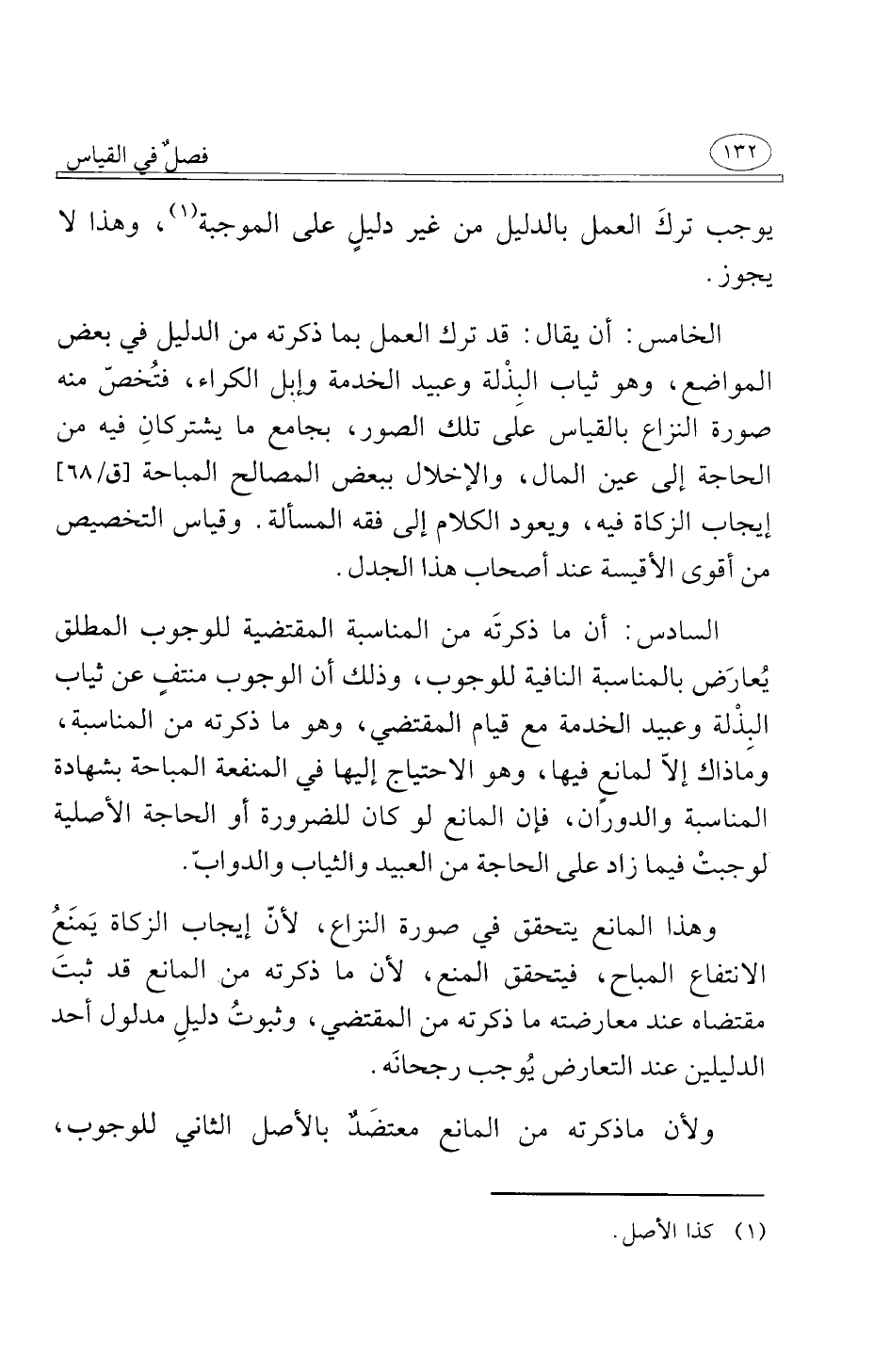 السادس أن ما ذكرتَه من المناسبة المقتضية للوجوب المطلق يُعارَض بالمناسبة النافية للوجوب وذلك أن الوجوب منتفٍ عن ثياب البِذْلة وعبيد الخدمة مع قيام المقتضي وهو ما ذكرته من المناسبة وما ذاك إلاّ لمانعٍ فيها وهو الاحتياج إليها في المنفعة المباحة بشهادة المناسبة والدوران فإن المانع لو كان للضرورة أو الحاجة الأصلية لوجبتْ فيما زاد على الحاجة من العبيد والثياب والدوابّ
