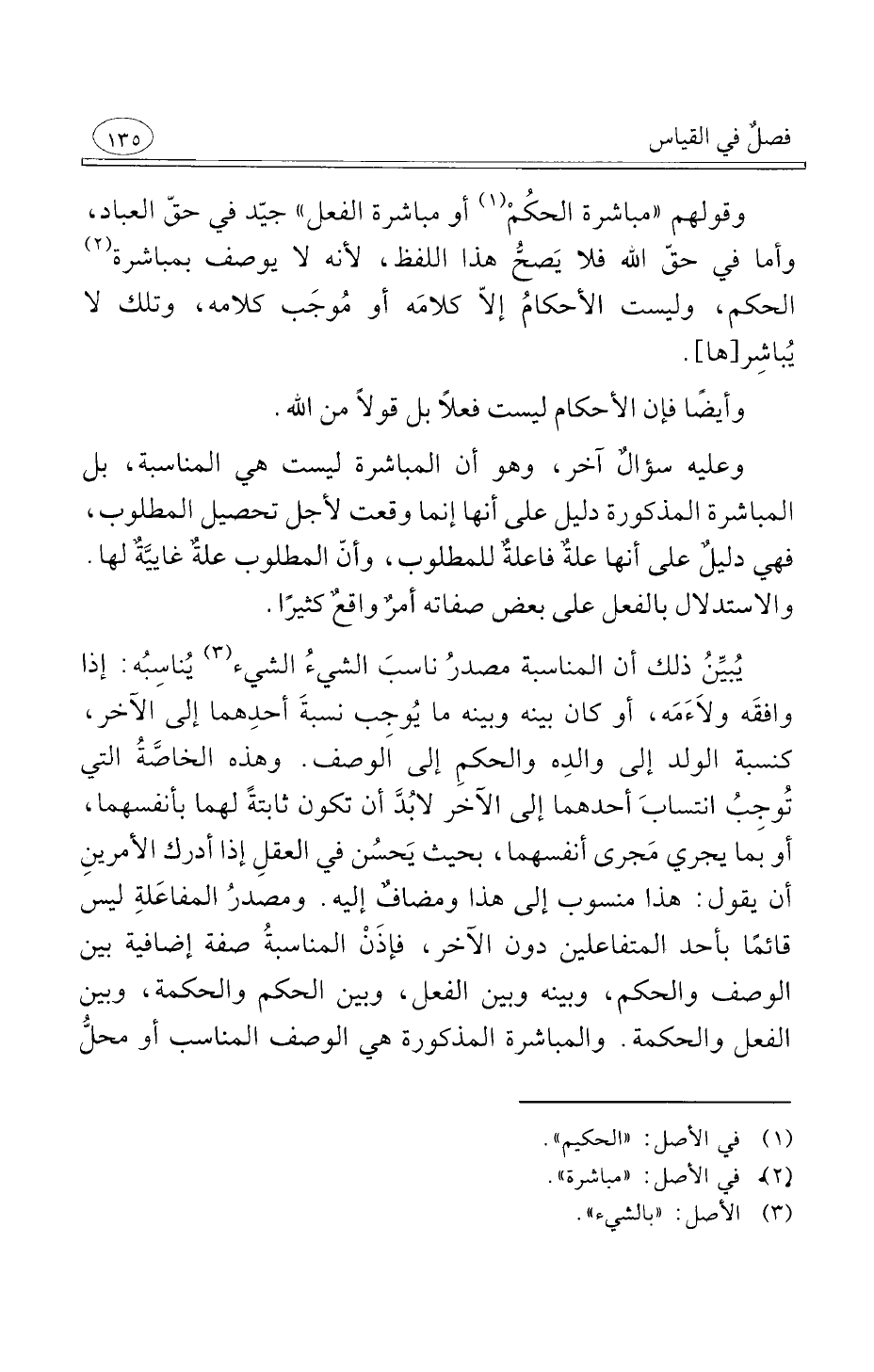 يُبيِّنُ ذلك أن المناسبة مصدرُ ناسبَ الشيءُ الشيء يُناسِبُه إذا وافقَه ولاَءَمَه أو كان بينه وبينه ما يُوجِب نسبةَ أحدِهما إلى الآخر كنسبة الولد إلى والدِه والحكمِ إلى الوصف وهذه الخاصَّةُ التي تُوجِبُ انتسابَ أحدهما إلى الآخر لابُدَّ أن تكون ثابتةً لهما بأنفسهما أو بما يجري مَجرى أنفسهما بحيث يَحسُن في العقلِ إذا أدرك الأمرينِ أن يقول هذا منسوب إلى هذا ومضافٌ إليه ومصدرُ المفاعَلةِ ليس قائمًا بأحد المتفاعلين دون الآخر فإذّنْ المناسبةُ صفة إضافية بين الوصف والحكم وبينه وبين الفعل وبين الحكم والحكمة وبين الفعل والحكمة والمباشرة المذكورة هي الوصف المناسب أو محلُّ