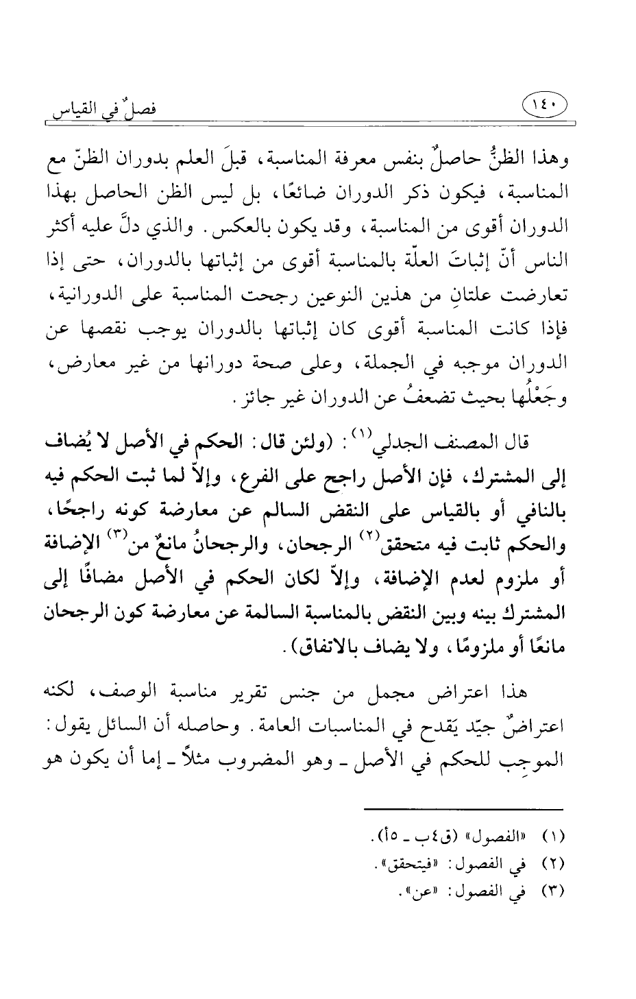 وهذا الظنُّ حاصلٌ بنفس معرفة المناسبة قبلَ العلم بدوران الظنّ مع المناسبة فيكون ذكر الدوران ضائعًا بل ليس الظن الحاصل بهذا الدوران أقوى من المناسبة وقد يكون بالعكس والذي دلَّ عليه أكثر الناس أنّ إثباتَ العلّة بالمناسبة أقوى من إثباتها بالدوران حتى إذا تعارضت علتانِ من هذبن النوعين رجحت المناسبة على الدورانية فإذا كانت المناسبة أقوى كان إثباتها بالدوران يوجب نقصها عن الدوران موجبه في الجملة وعلى صحة دورانها من غير معارض وجَعْلُها بحيث تضعفُ عن الدوران غير جائز