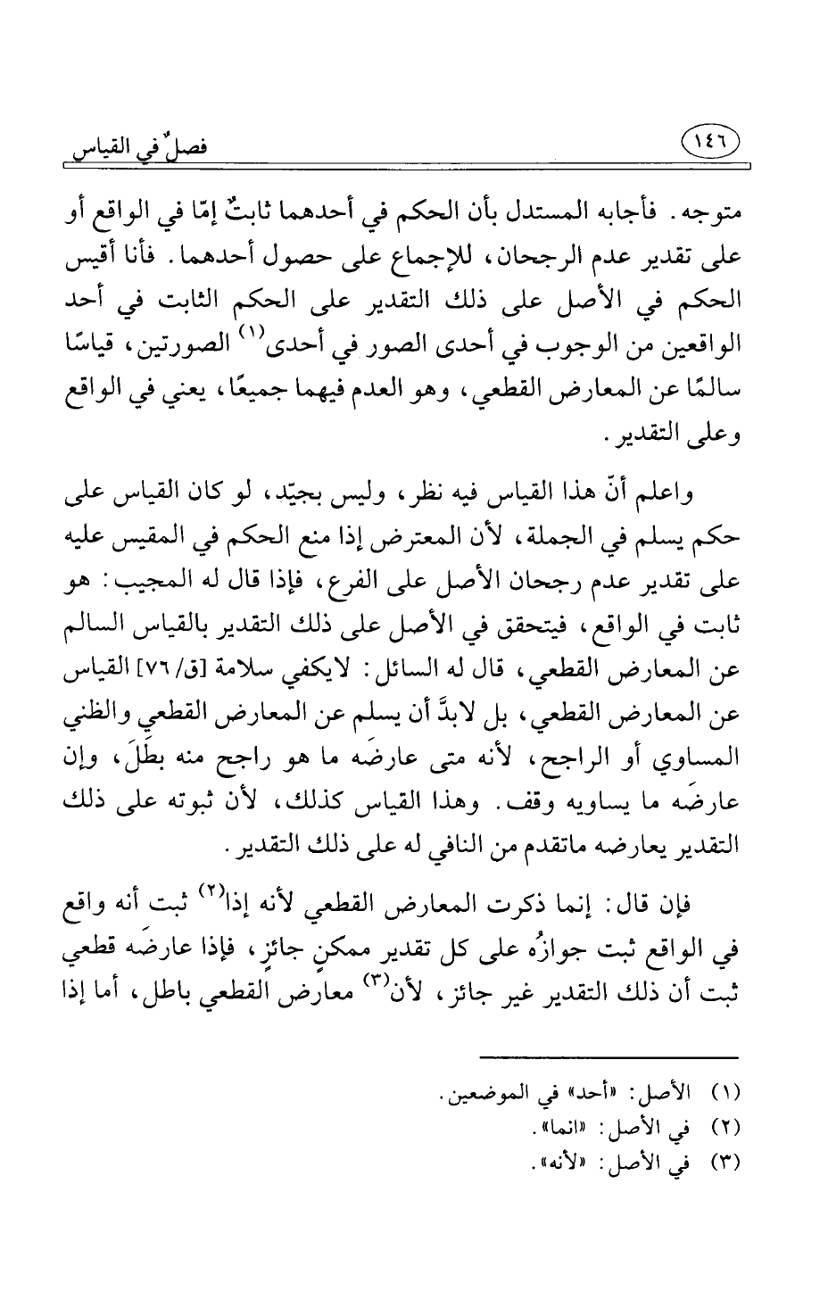 واعلم أنّ هذا القياس فيه نظر وليس بجيّد لو كان القياس على حكم يسلم في الجملة لأن المعترض إذا منع الحكم في المقيس عليه على تقدير عدم رجحان الأصل على الفرع فإذا قال له المجيب هو ثابت في الواقع فيتحقق في الأصل على ذلك التقدير بالقياس السالم عن المعارض القطعي قال له السائل لا يكفي سلامة القياس عن المعارض القطعي بل لابدَّ أن يسلم عن المعارض القطعي والظني المساوي أو الراجح لأنه متى عارضَه ما هو راجح منه بطَلَ وإن عارضَه ما يساويه وقف وهذا القياس كذلك لأن ثبوته على ذلك التقدير يعارضه ما تقدم من النافي له على ذلك التقدير