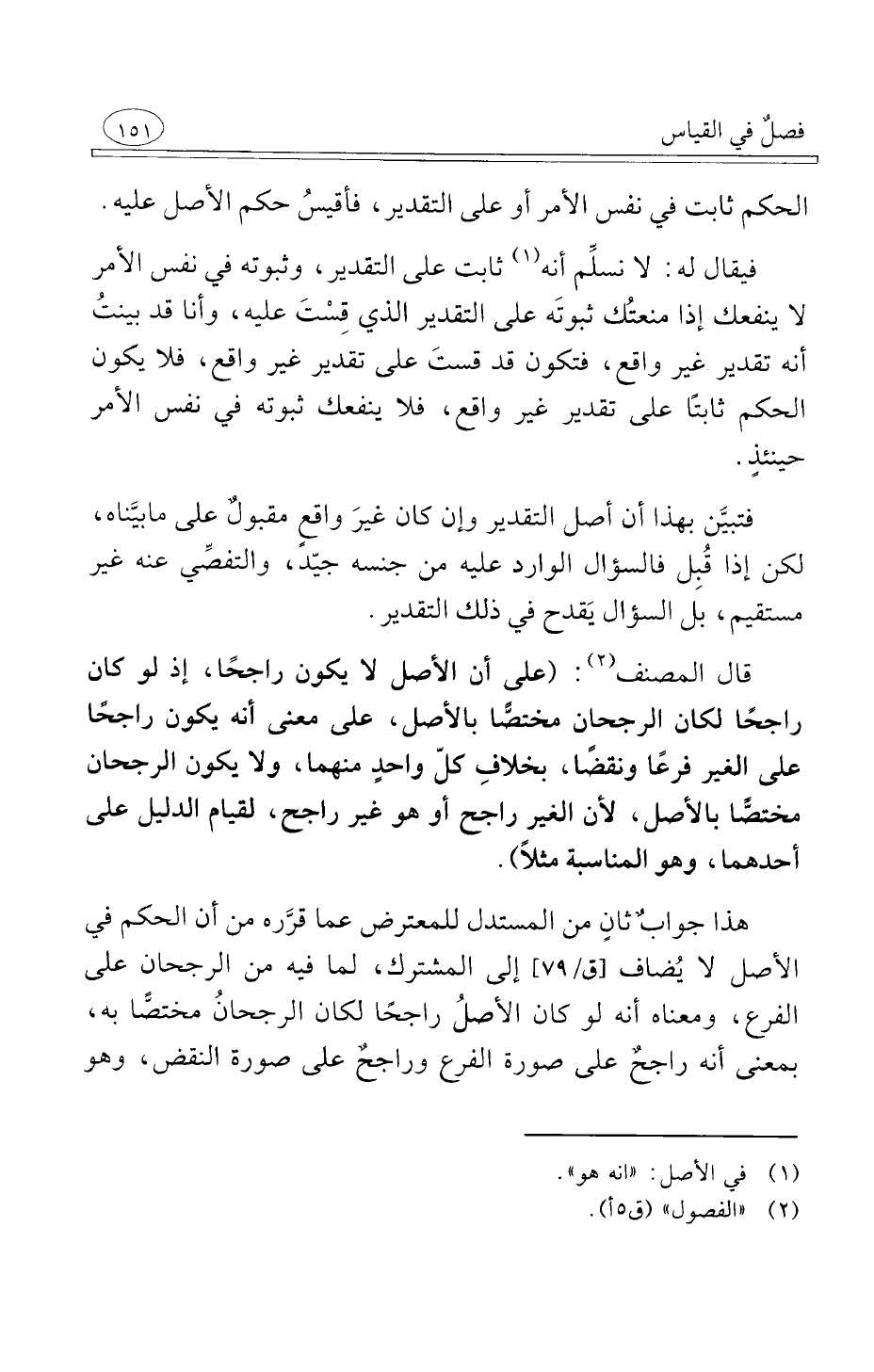 قال المصنف على أن الأصل لا يكون راجحًا إذ لو كان راجحًا لكان الرجحان مختصًّا بالأصل على معنى أنه يكون راجحًا على الغير فرعًا ونقضًا بخلافِ كلّ واحدٍ منهما ولا يكون الرجحان مختصًّا بالأصل لأن الغير راجح أو هو غير راجح لقيام الدليل على أحدهما وهو المناسبة مثلاً