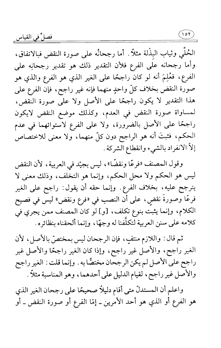 وقول المصنف فرعًا ونقضًا ليس بجيّد في العربية لأن النقض ليس هو الحكم ولا محل الحكم وإنما هو التخلف وذلك معنى لا يترجح عليه بخلاف الفرع وإنما حقه أن يقول راجح على الغير فرعًا وصورةَ نقيضٍ على أن النصب في فرع ونقض ليس في فصيح الكلام وإنما يثبت بنوع تكلف و لو كان المصنف ممن يجري في كلامه على سنن العربية لتكلَّفنا له وجهًا وإنما ألحقناه بنظائره