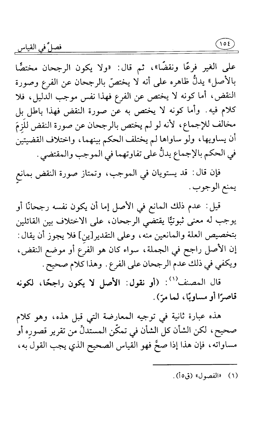 على الغير فرعًا ونقضًا ثم قال ولا يكون الرجحان مختصًّا بالأصل يدلُّ ظاهره على أنه لا يختصّ بالرجحان عن الفرع وصورة النقض أما كونه لا يختص عن الفرع فهذا نفس موجب الدليل فلا كلام فيه وأما كونه لا يختص به عن صورة النقض فهذا باطل بل مخالف للإجماع لأنه لو لم يختص بالرجحان عن صورة النقض للَزِمَ أن يساويها ولو ساواها لم يختلف الحكم بينهما واختلاف القضيتين في الحكم بالإجماع يدلُّ على تفاوتهما في الموجب والمقتضي