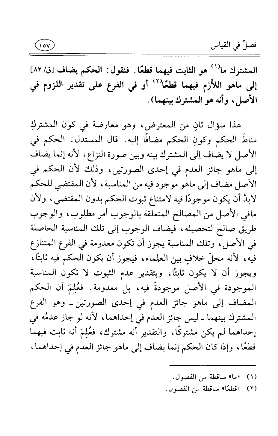 المشترك ما هو الثابت فيهما قطعًا فنقول الحكم يضاف إلى ما هو اللاَّزم فيهما قطعًا أو في الفرع على تقدير اللزوم في الأصل وأنه هو المشترك بينهما