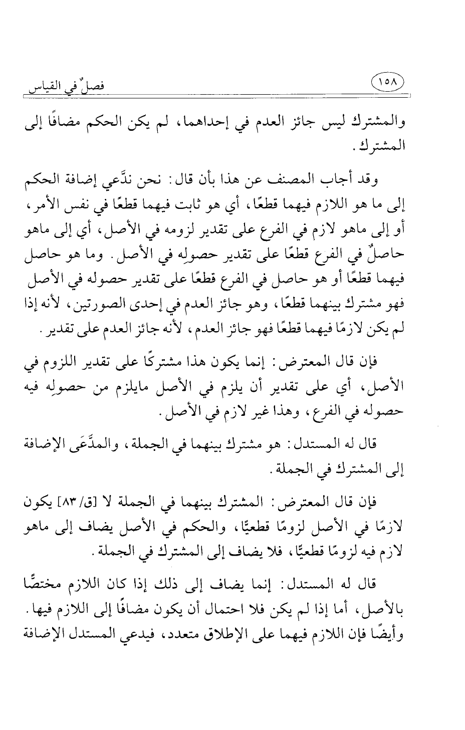 فإن قال المعترض المشترك بينهما في الجملة لا يكون لازمًا في الأصل لزومًا قطعيًّا والحكم في الأصل يضاف إلى ما هو لازم فيه لزومًا قطعيًا فلا يضاف إلى المشترك في الجملة