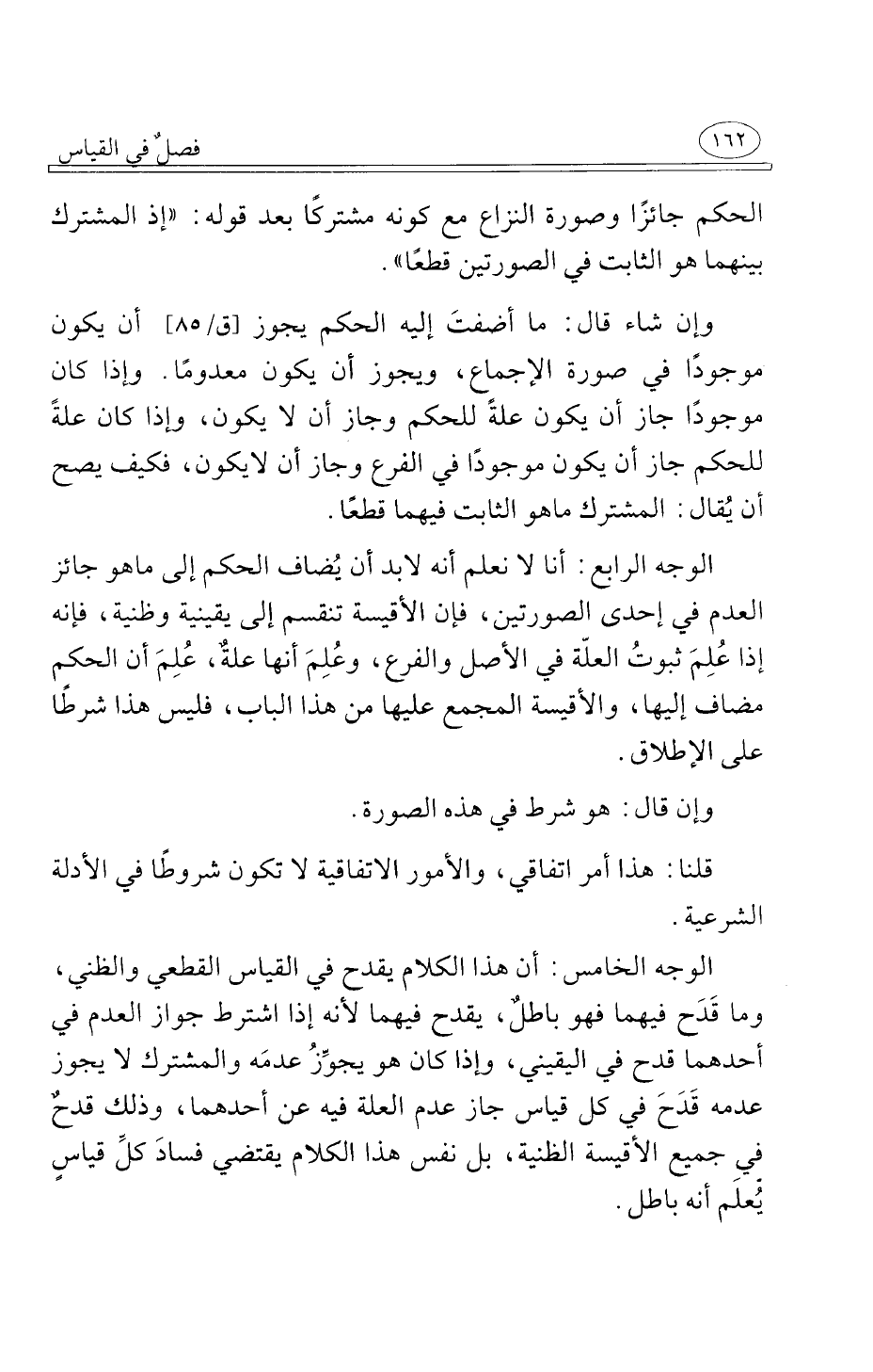 الوجه الخامس أن هذا الكلام يقدح في القياس القطعي والظني وما قَدَح فيهما فهو باطلٌ يقدح فيهما لأنه إذا اشترط جواز العدم في أحدهما قدح في اليقيني وإذا كان هو يجوِّزُ عدمَه والمشترك لا يجوز عدمه قَدَحَ في كل قياس جاز عدم العلة فيه عن أحدهما وذلك قدحٌ في جميع الأقيسة الظنية بل نفس هذا الكلام يقتضي فسادَ كلِّ قياسٍ يُعلَم أنه باطل