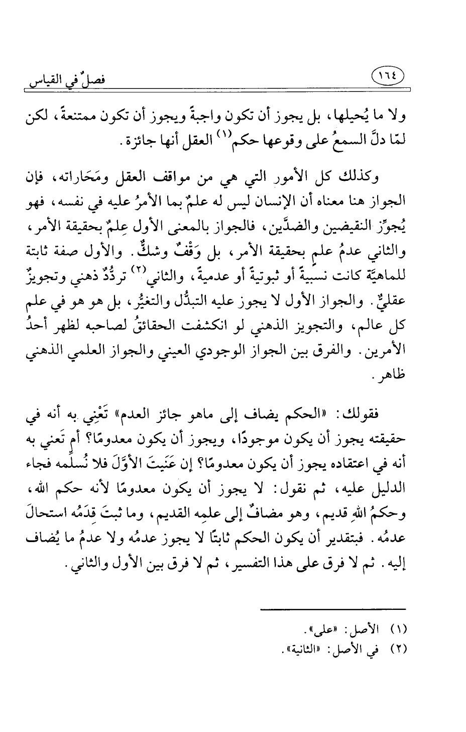 وكذلك كل الأمور التي هي من مواقف العقل ومَحَاراته فإن الجواز هنا معناه أن الإنسان ليس له علمٌ بما الأمرُ عليه في نفسه فهو يُجوِّز النقيضين والضدَّين فالجواز بالمعنى الأول عِلمٌ بحقيقة الأمر والثاني عدمُ علمٍ بحقيقة الأمر بل وَقْفٌ وشكٌّ والأول صفة ثابتة للماهيَّة كانت نسبيةً أو ثبوتيةً أو عدميةً والثاني تردُّدٌ ذهني وتجويزٌ عقليٌّ والجواز الأول لا يجوز عليه التبدُّل والتغيُّر بل هوهو في علم كل عالم والتجويز الذهني لو انكشفت الحقائقُ لصاحبه لظهر أحدُ الأمرين والفرق بين الجواز الوجودي العيني والجواز العلمي الذهني ظاهر