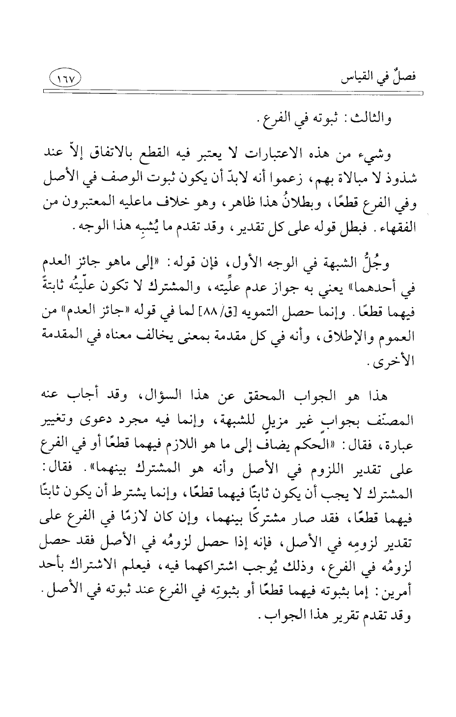 هذا هو الجواب المحقق عن هذا السؤال وقد أجاب عنه المصنّف بجوابٍ غير مزيلٍ للشبهة وإنما فيه مجرد دعوى وتغيير عبارة فقال الحكم يضاف على ما هو اللازم فيهما قطعًا أو في الفرع على تقدير اللزوم في الأصل وأنه هو المشترك بينهما فقال المشترك لا يجب أن يكون ثابتًا فيهما قطعًا وإنما يشترط أن يكون ثابتًا فيهما قطعًا فقد صار مشتركًا بينهما وإن كان لازمًا في الفرع على تقدير لزومِه في الأصل فإنه إذا حصل لزومُه في الأصل فقد حصل لزومُه في الفرع وذلك يُوجب اشتراكهما فيه فيعلم الاشتراك بأحد أمرين إما بثبوته فيهما قطعًا أو بثبوتِه في الفرع عند ثبوته في الأصل وقد تقدم تقرير هذا الجواب